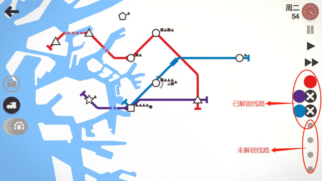 站台旁边的小图形代表该站点乘客的数量以及乘客的目的站台,乘客需要抵达与其符号形状相同的车站。