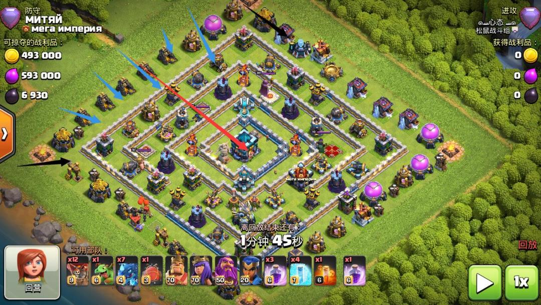在不给狂暴的情况下1.5秒可以爆本 且没有建筑可以攻击到隐身的哥布林 尤其是图中类似的大本中置 有的时候大部队会绕圈
