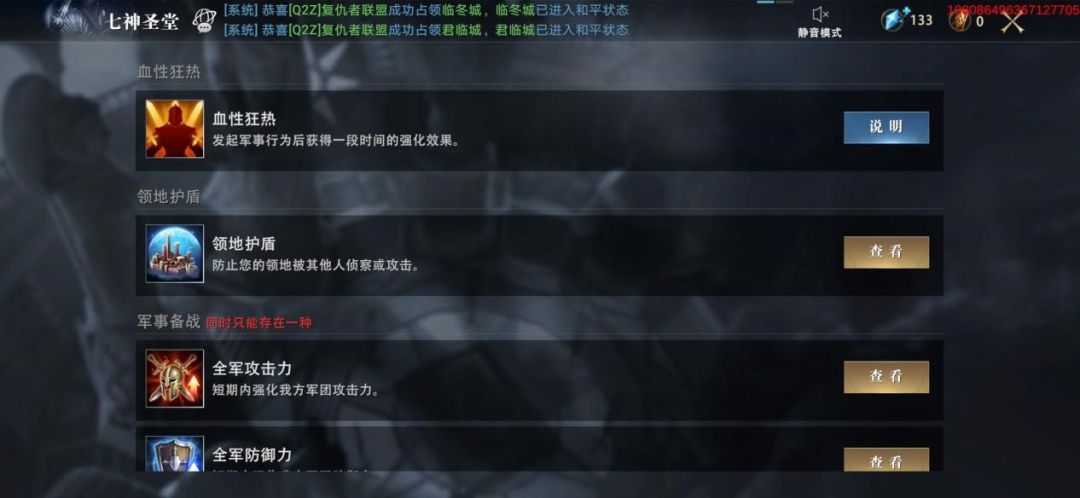 在国战期间也可以通过在商城购买相应BUFF来保证自己的军事目的更好实现,比如在休战协定无法作用时可以通过购买领地护盾来保证自己的领地安全,可以做出移民或者转移其他驻扎点等措施。