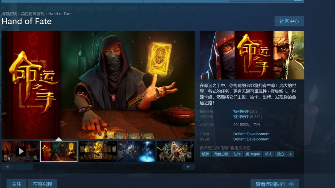 今天要推荐的是一款steam游戏,《命运之手》/《Hand of Fate》说来也是我第一款正版游戏呢。(原价68,hb网一美元买的,赚到)(G胖:我就喜欢你这样的玩家。)