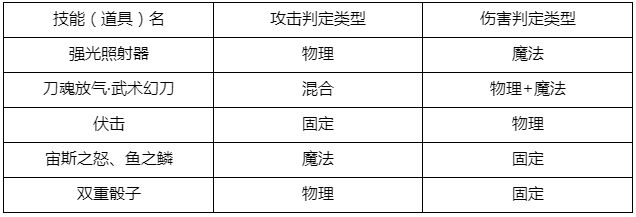 在游戏中,所有攻击者都是通过「攻击」对方来造成「伤害」的,由此可以看出「攻击」和「伤害」息息相关,但却是两个不同的概念,不过他们所对应的「判定类型」都可以分为物理、魔法、混合、固定四类。一般情况下,技能的「攻击判定类型」和「伤害判定类型」是相对应的,即物理攻击造成物理伤害、魔法攻击造成魔法伤害,但也有一些比较特殊的技能,比如以下几个技能: