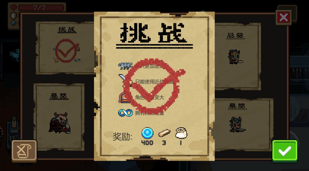 更新2.2.1版本后,每天最多可更换15次挑战。完整挑战且领取挑战奖励后,进入公告板,按下图提示操作(点击绿色对勾按钮)后,再次和警官对话,可刷新挑战因子。