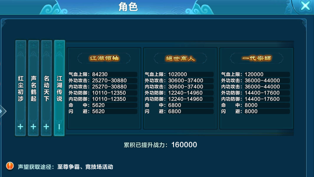 少侠在江湖历练时没个合适的称号怎么行,行侠仗义中少侠会获得江湖声望,获得足够的声望并成功挑战称号所需通过的地牢天井副本层数,即可升级少侠的江湖称号,提供永久的属性增益,从一个江湖小虾米成为人人传颂的一代宗师。
