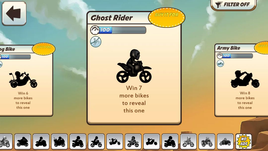 游戏的另一个模式,多人比赛,则是比拼各自技艺的地方了,选择一张地图,使出浑身解数,谁最先到终点就可以赢得比赛的胜利,而比赛的模式,有点像爬坡赛2的方式,对象是以幻影存在的,比赛中他不会骚扰到你。而最关键的奖励,就是摩托车形象了,我们达到一定次数的胜利后,会解锁各式各样的形象,这对于收集控玩家来说,绝对是个福音。