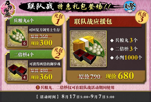 礼包3:兵粮丸*3、二倍枡*3、小判*1000。原价790甲州金,现在售价680甲州金。