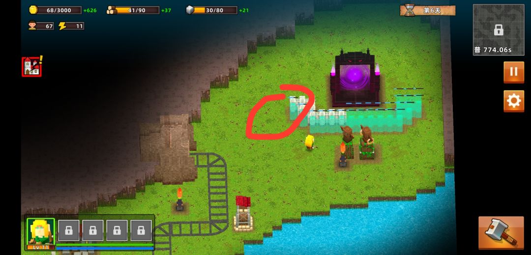 英雄一开始不要找矿车了,弹簧也不用带,英雄只清到达传送门这条路上的怪,越快越好,到达下图这里时门出的第二波怪打完了,开始建防御塔(两个箭塔较好)和墙清理门附近的哥布林(因为有双斧兽人很难打)