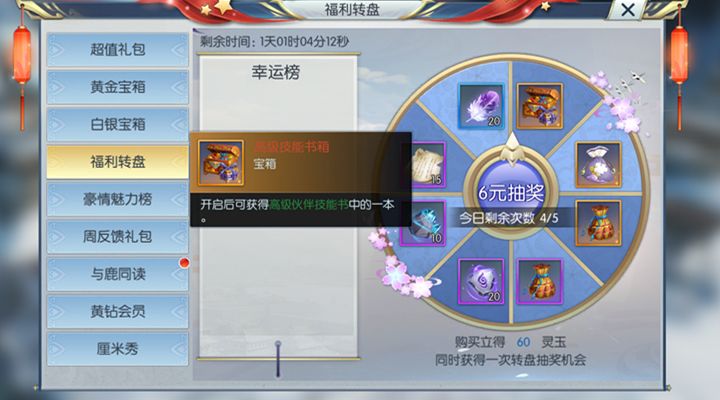 进入游戏,打开右上角头像下的精彩活动就能看到我们的福利转盘活动了,玩家可以在福利转盘活动中购买转盘抽奖次数进行抽奖,每天可以抽奖5次,每次购买次数需要花费6元RMB,但同时也是可以得到60灵玉的。