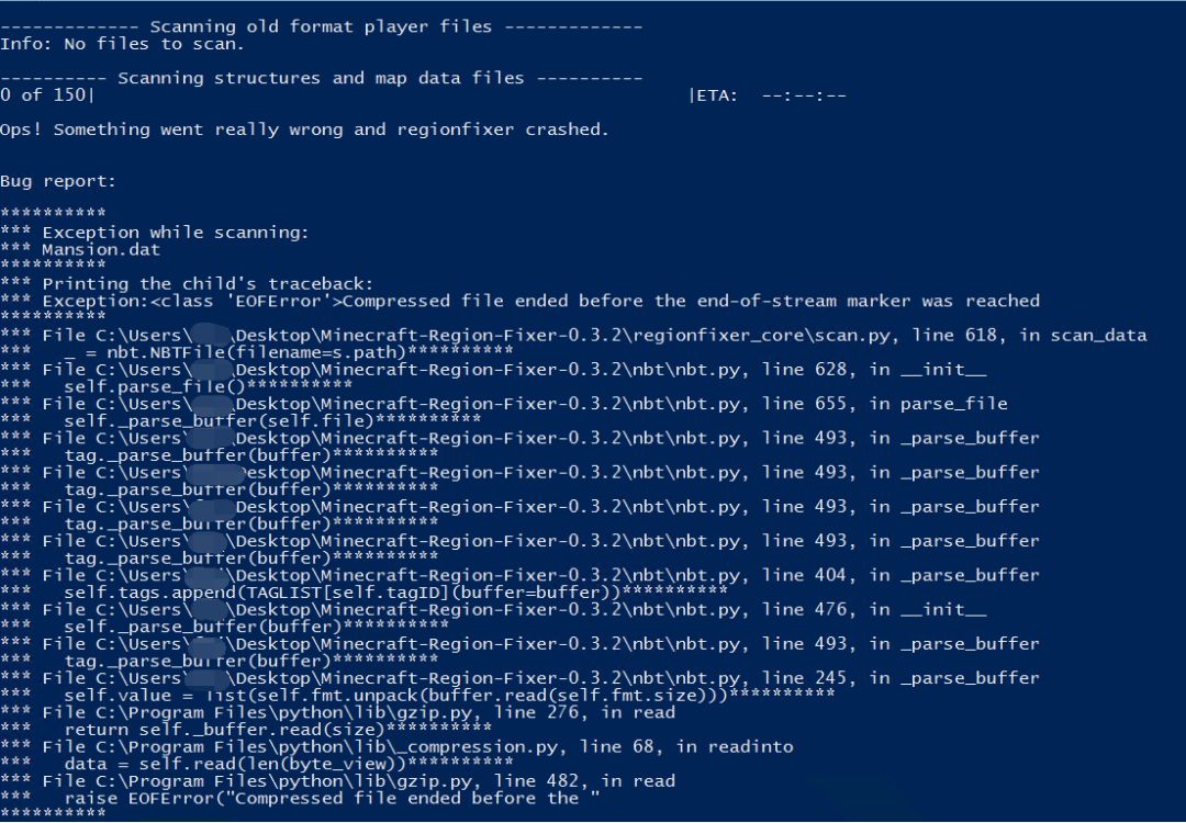2020年5月14日12时31分,按照惯例使用Minecraft-Region-Fixer扫描出错存档,但扫描Region文件时返回错误。