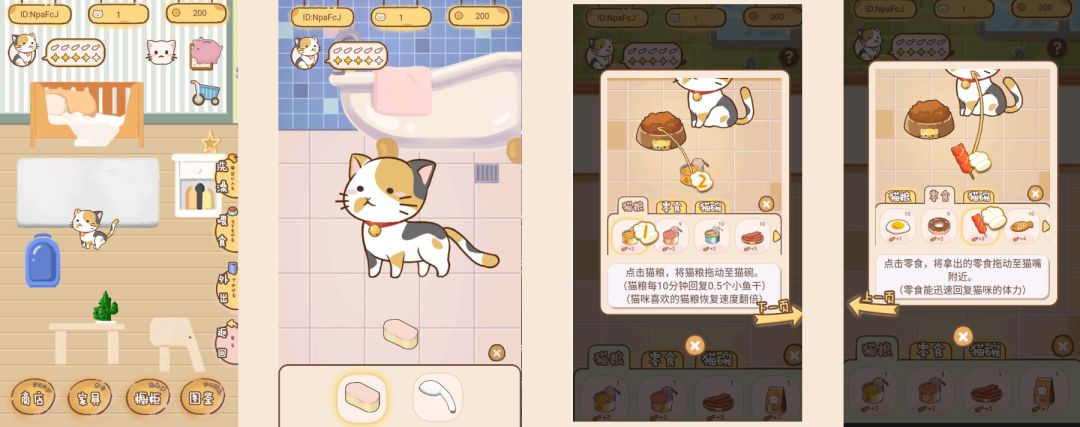 当你回到家中,点击猫咪撸喵~ 叮叮~ 恭喜你,你开启了和喵咪最重要的互动环节~ 这时右侧会出现洗澡、喂食和外出的选项,让我为你一一道来。首先是洗澡,记得好好拿海绵打上泡沫,然后拿出喷头冲干净,猫咪们高兴了就蹦着跳着走了。猫宅中的小喵咪们都是猫中龙凤,都不会乱跑乱跳的捏Σ( °△ °|||)︴ 如果是真猫,一定要控制好他,而且记得要擦干,吹风机好好吹干哦~ 接下来是喂食,我们贴心右上角放了小问号,点了就能知道怎么喂了哦。记得猫粮丢进猫碗里,小猫咪慢慢会吃完的(一般都会花10分钟左右的,猫咪吃猫粮的时候,你能回猫宅去干别的,如果你非要盯着小猫咪慢慢吃完,你有这种爱好,我也不会拦着你的 (눈_눈) )。小零食都是猫咪们的心头爱,要铲屎官们主动递到嘴边(小猫咪:╭(╯^╰)╮哼,看在你这么诚心诚意的上贡了,朕赏脸吃掉咯~) 等喵主子吃完,小鱼干就会涨,你就能拎着他外出逛街去了~