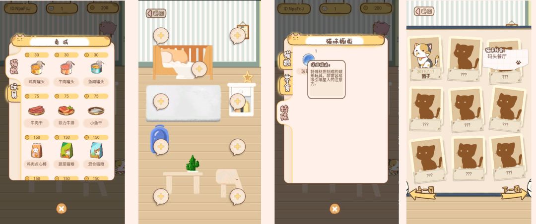 下方的四个图标再简单介绍下~ 商店点开可以进入商城,里面有猫粮和零食,具体用法可以在后面猫咪互动里讲下,(推了推眼镜。玩具现在还没有做好,所以也没开放,本来是想做成这种,拿出来个逗猫棒就能在猫宅中逗猫玩的。)点击下面的家具,是可以替换家中的家具和购买新家具的~ 现在我们做成可以点击加号替换列表中家具了,不过怕大小太多难调整位置,现在有大件、小件家具和地毯的区别的。再右边是橱柜,在里面你放着猫主子们的猫粮和零食,并且有特殊道具,在后续外出里解锁商店街后,兑换其他内容的。再右边是你的猫主子的图鉴相册咯~ 点开可以看到你的猫片(大头靓照),记录了你猫咪获得日期名字,还有一些猫的获得线索。作为个合格的铲屎官,要了解猫咪的信息和喜欢的食物哦~ 当然吃到喜欢的食物的时候,猫咪可能会吃的很快的哟(>^ω^<)