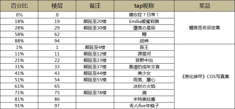 1. 活动结束后一周内,总楼层的8%、18%、28%、58%、88%将获得鳗鱼签名版恙化装甲设定集2.0一本