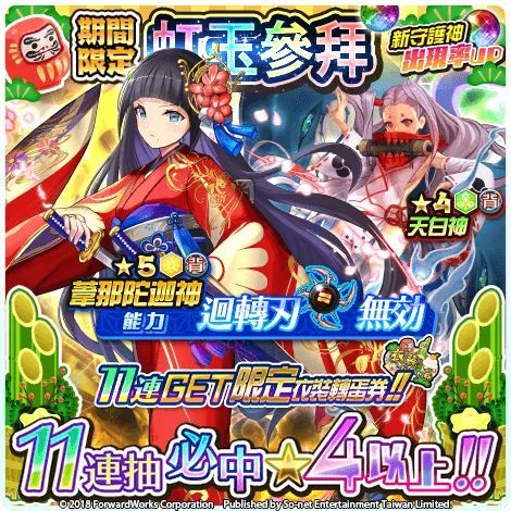 參拜期間內,只要使用有償虹玉1,100顆(限1次)或免費虹玉2,500顆(無次數限制)進行11連抽參拜,必中一隻★4以上守護神!