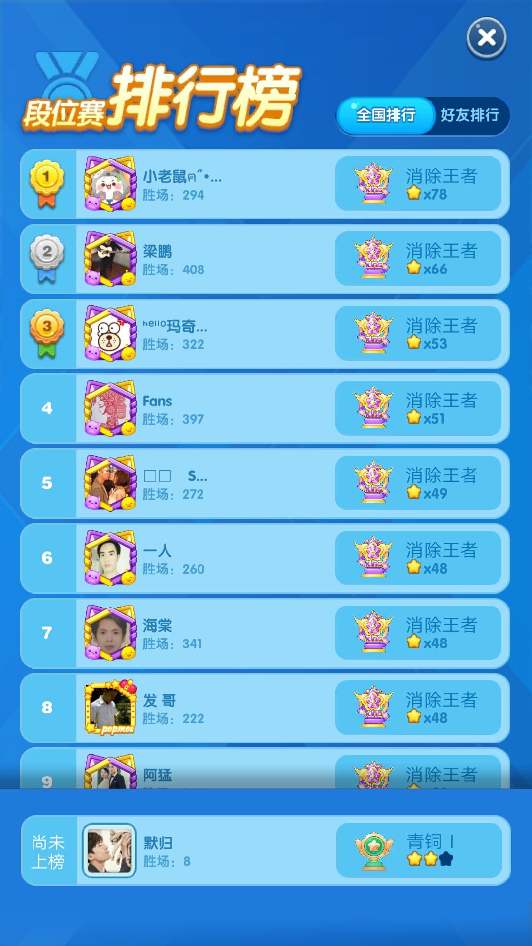 段位赛模式的最右侧有一个排行榜选项,点开排行榜,你不仅能看到游戏好友的段位排行,更能和全国各地的消除高手一决高下。
