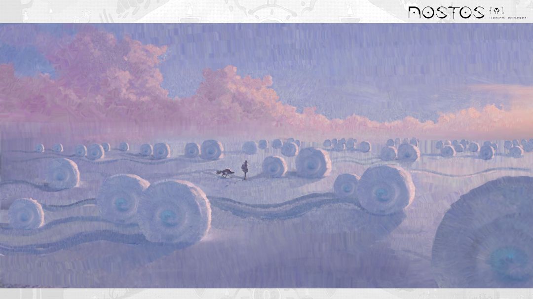 主美希望Nostos的设计和VR的特色能够产生一些有趣的碰撞,建立一个不完全脱离真实,充满了幻想与奇遇的世界。美术希望Nostos能成为每个长大的孩子心中,那个忘却的乌托邦,即便被纷扰忙乱的生活封存在记忆深处,一旦被唤醒,就会感到一种熟悉与亲切,纯粹与欢愉。因此,美术建立了现在所使用的东方动画电影风格,用水彩画的氛围,来表现Nostos特有的韵律。