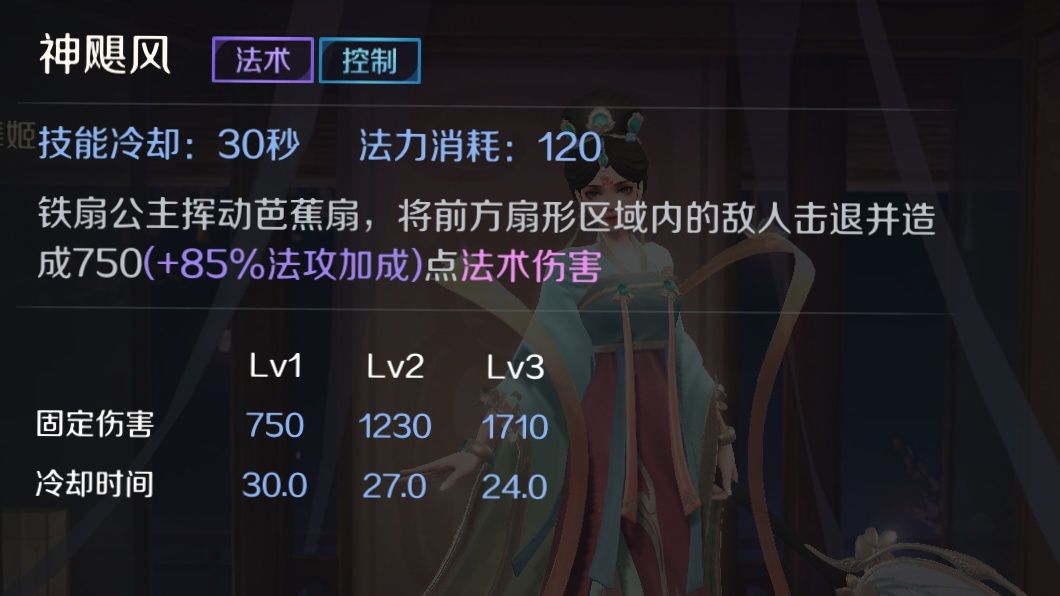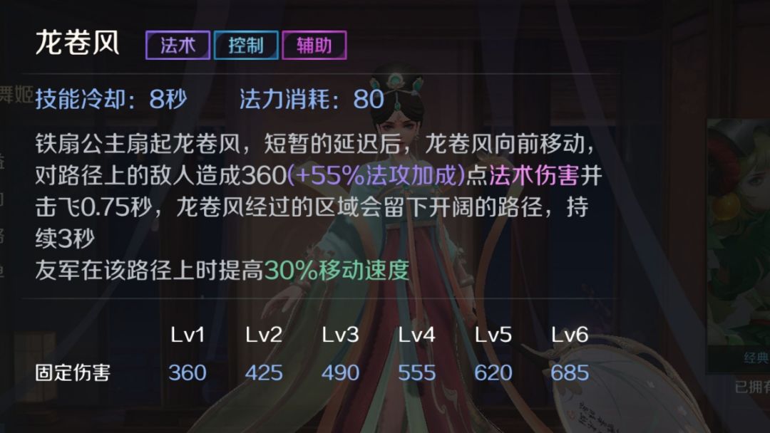 一技能:龙卷风 铁扇公主用芭蕉扇朝指定方向卷起一道龙卷风,龙卷风向前移动有短暂延迟,龙卷风对路径上的敌人造成法术伤害并造成击飞,击飞效果持续0.75s,龙卷风经过会留下路径,友军在该路径上会提升自身30%移动速度,路径持续时间3s。