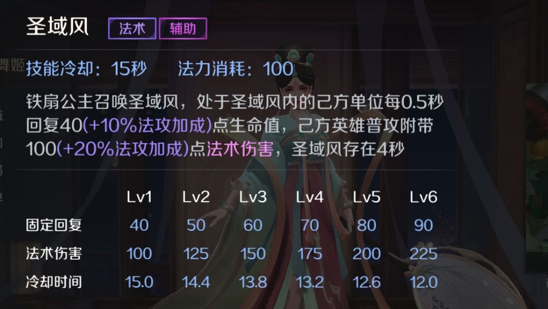 二技能:圣域风 铁扇公主原地召唤一个圆形的区域圣域风,处在圣域风内可以为友军回复部分生命值,并且处在圣域风内的友军普攻附带额外法术伤害,圣域风存在时间持续4s,回复生命值和普攻附带法术伤害与铁扇公主自身法术攻击正相关。