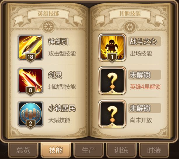 英雄技能主要分为战斗技能、出场技能、天赋技能、冒险技能以及生活技能等5大类。