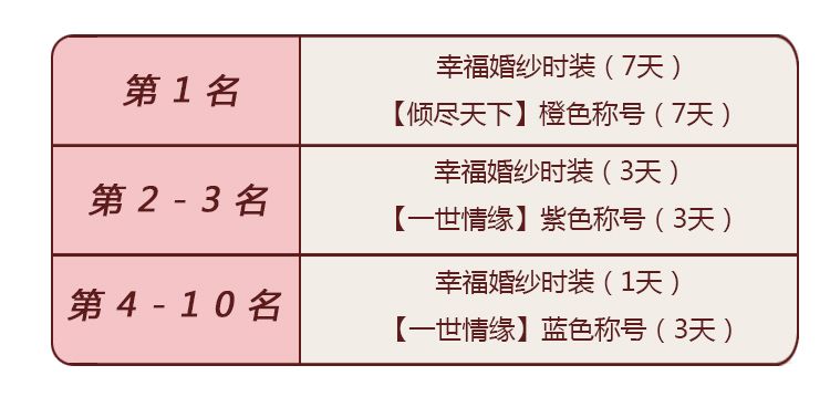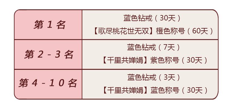 活动奖励:七夕限定鲜花榜分为4个榜单:护花日榜、倾城日榜、豪情周榜、魅力周榜。其中护花日榜和倾城日榜每日23:59结算并重置;豪情周榜和魅力周榜在周日23:59结算。