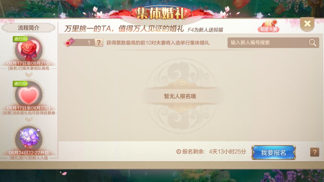 七夕佳节来临,集体婚礼活动也开始报名啦!在8月17日~8月21日期间,宝宝们只要和自己的伴侣组队,点开集体婚礼获得界面就阔以报名了。爱ta就给ta来一场万众瞩目的婚礼吧~