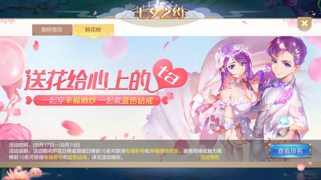 在七夕鲜花榜单开放期间,宝宝们送花、收花所获得的魅力值、豪情值将会进行排行,数值相同时,将会按获得先后顺序排行。每个榜单的前10名的宝宝在结算后都可以获得限时专属称号、幸福婚纱时装或者蓝色钻戒~