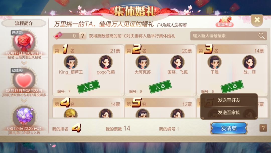 俗话说,人多力量大,集体婚礼报名完成后,宝宝们赶紧通过家族群、游戏圈子、贴吧等各个平台为自己拉票吧,投票活动期间最终人气排行前10对的宝宝,就可以入选举行集体婚礼啦~