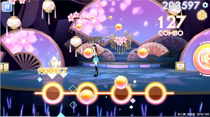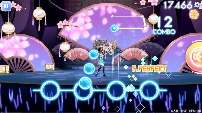 在《双人舞》音乐开篇,就是各种蛇形排列顺序的单击音符,期间会夹杂着快速的三连击加滑动转折音符。在这一系列的音符组合当中,滑动音符并不是单向的从左至右或从右至左滑动,而是在朝某个方向滑动后会短暂停顿后再滑动回来。所以,在这个操作过程中,一定要把握好准确的时间点,并且操作时需要注意好来回方向。