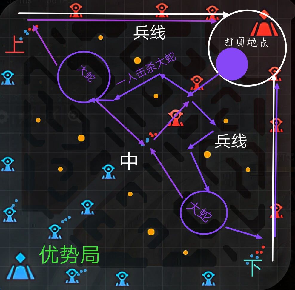 而在大蛇buff消失之前,重点是拥有大蛇buff的队友,以及未赶到战场的兵线,这两点是方案一取胜的核心,保护大蛇buff以及兵线。