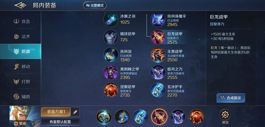 出装我建议出这套辅助肉装,白浩此版本自身缺乏持续作战能力,但是控制能力爆表。所以此版本的白浩在对局中的作用是打出群控为输出英雄创造输出环境。此出装的核心是肉和高恢复,辅助装还可以给输出英雄加血。(我知道让坦克做辅助有点难为情,但是这比真辅助还能辅助,真香!)