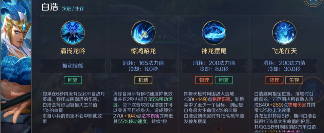 挥舞长枪对周围敌人造成180(+50.0%物攻加成)点物理伤害,如果命中了至少一个目标,则回复自身最大生命值4%的血量 白浩受到伤害时有15%概率触发神龙摆尾。