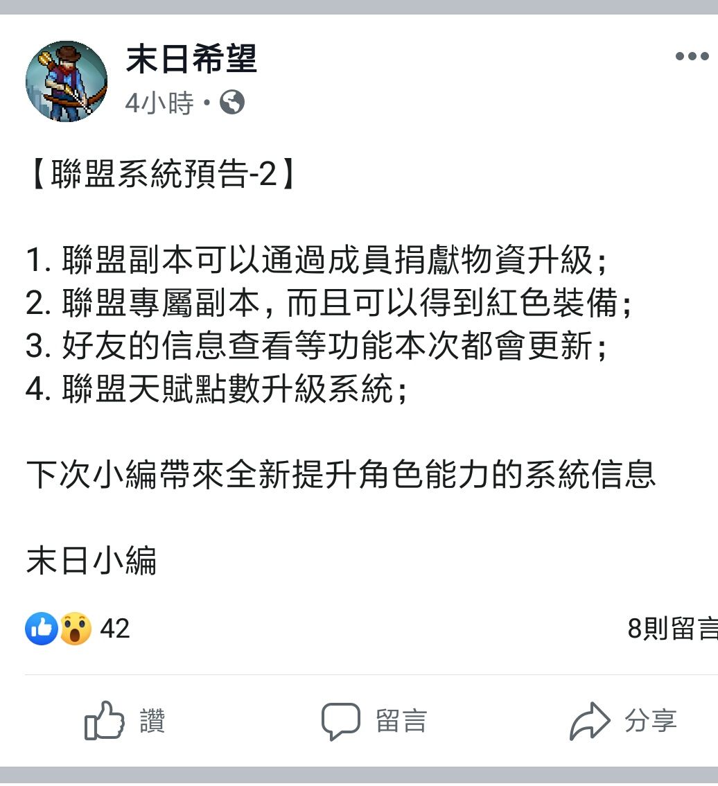 1. 聯盟副本可以通過成員捐獻物資升級; 2. 聯盟專屬副本,而且可以得到紅色裝備; 3. 好友的信息查看等功能本次都會更新; 4. 聯盟天賦點數升級系統; 下次小編帶來全新提升角色能力的系統信息