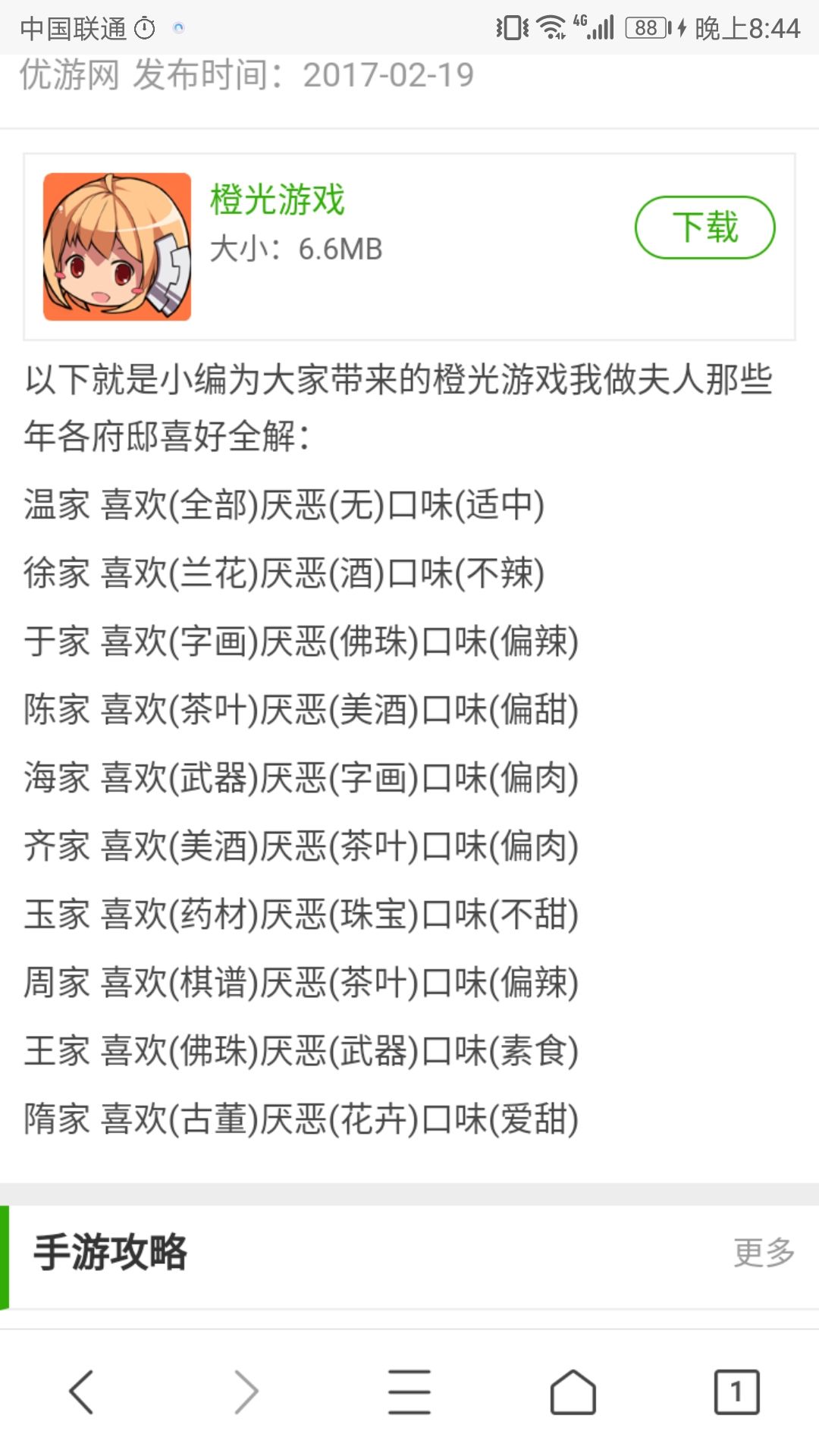 建议去举办宴会,各个世家的口味请百度查表。