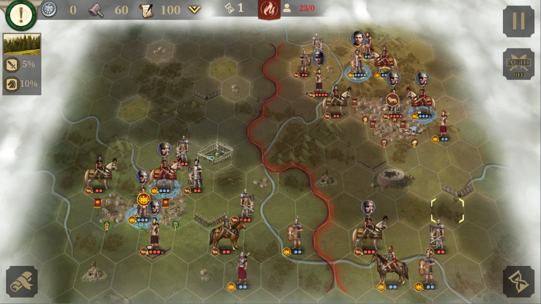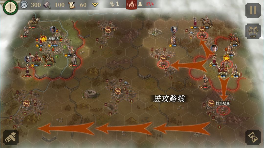 阿格里帕线的目标是击败20支敌军,守住3支关键部队,人口不低于25。本关是一场防守战,敌方兵力有点多,注意分配好各个进攻方向。两个城市最好都占下来,方便补充兵力。地图的最后上角会出现第5个关键部队:屋大维。地图不大,请时刻记住这是一场防守战。