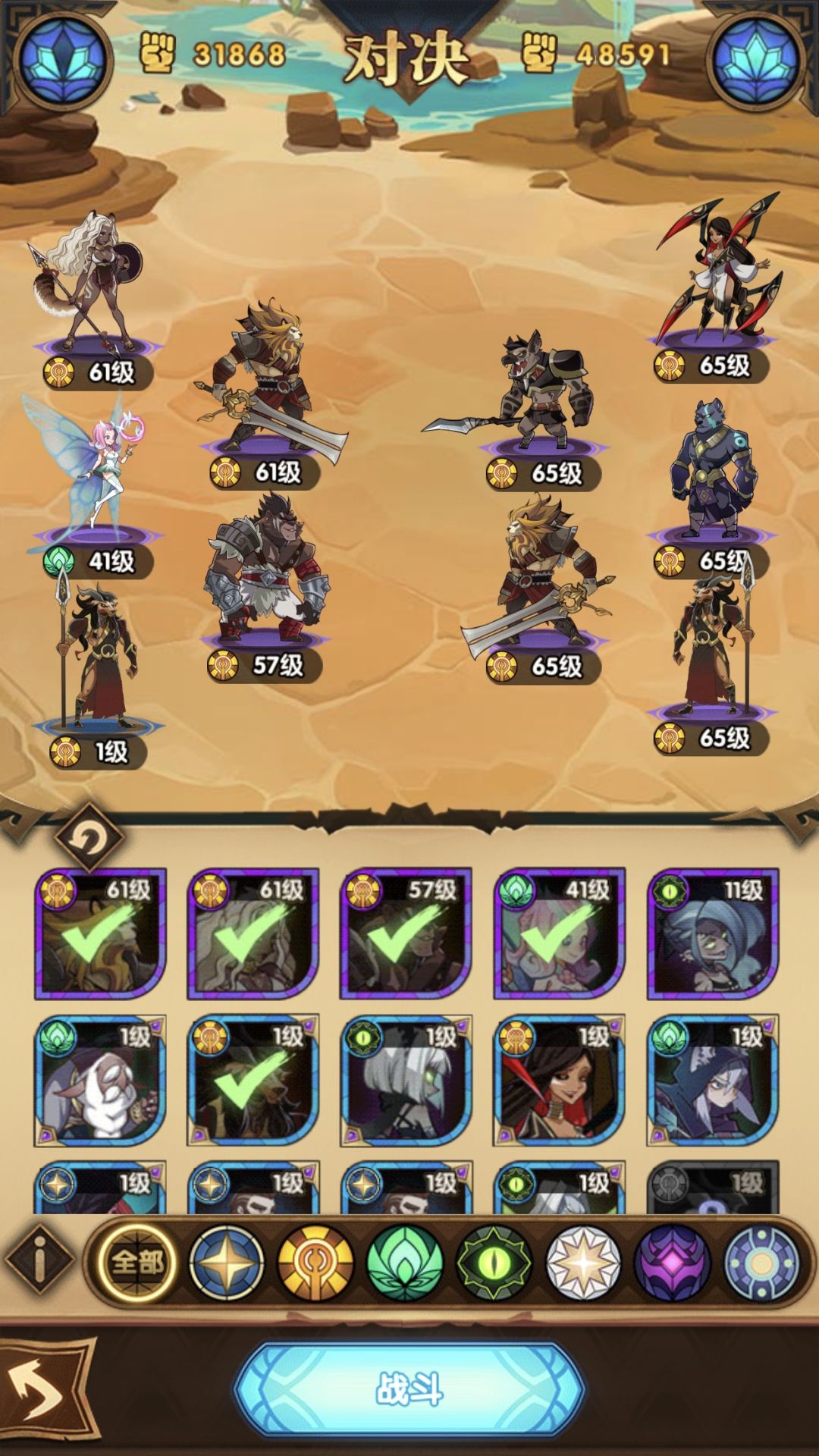 之后发育思路,在当前的抽卡下,应该是要把蝴蝶练起来,然后把老头练起来,围绕3蛮族和2绿意的思路走,毕竟蝴蝶和老头养了不亏,而且提供非常好的控制效果,能让豹女输出更持久,等羊头品质上来了,再把拍拍熊重置,给羊头,然后充当前排,豹女放后排。