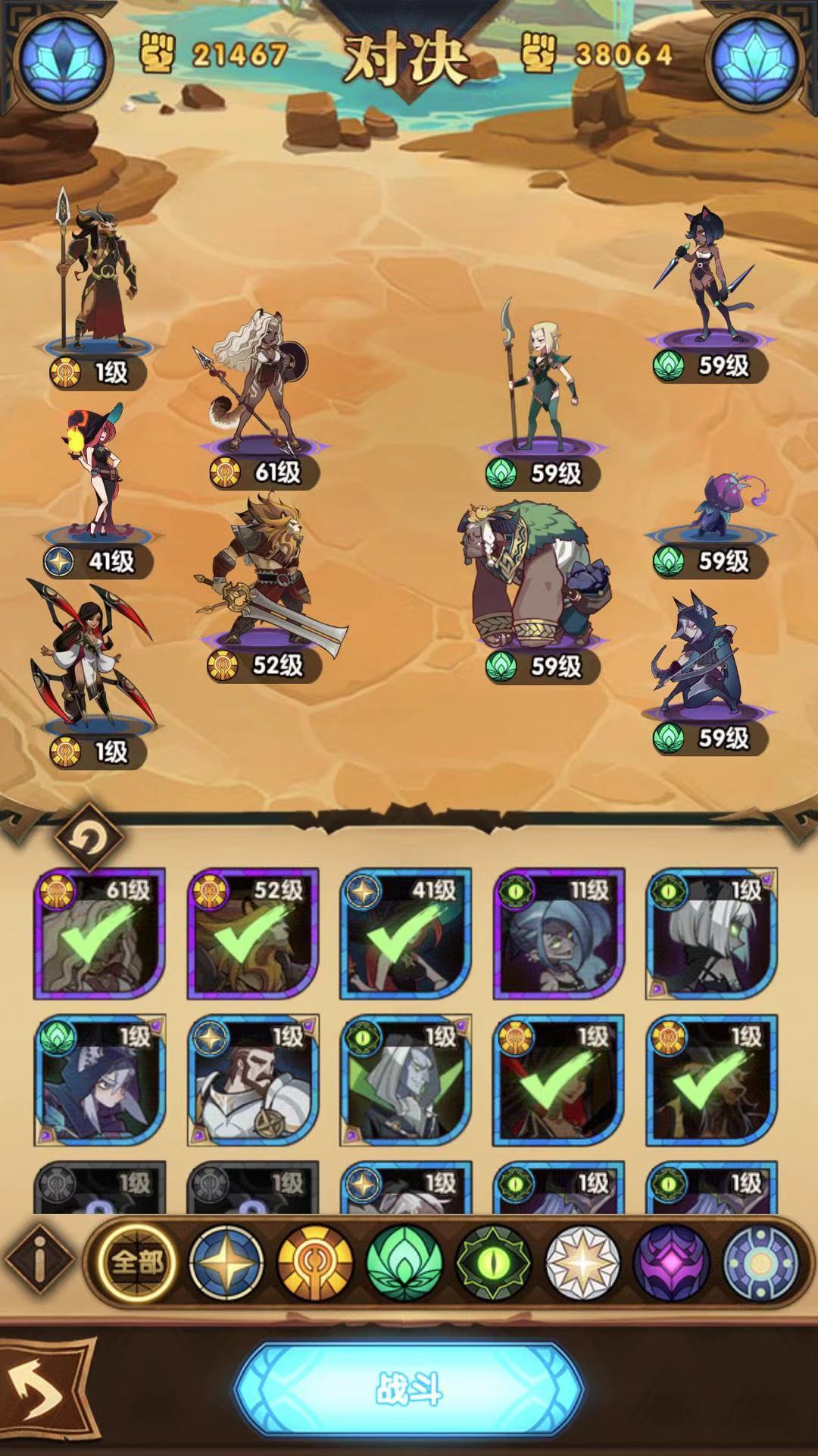 豹女和狮子谁先61级,一个是高回复一个是4秒无敌,我选择了前者,因为高回复在一局对战里,能反复触发,之后的思路是将狮子提升到61,火女可有可无吧。核心是豹女。