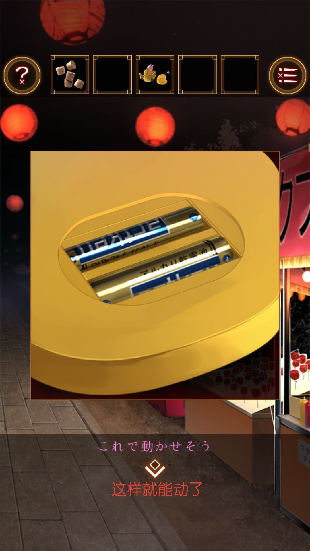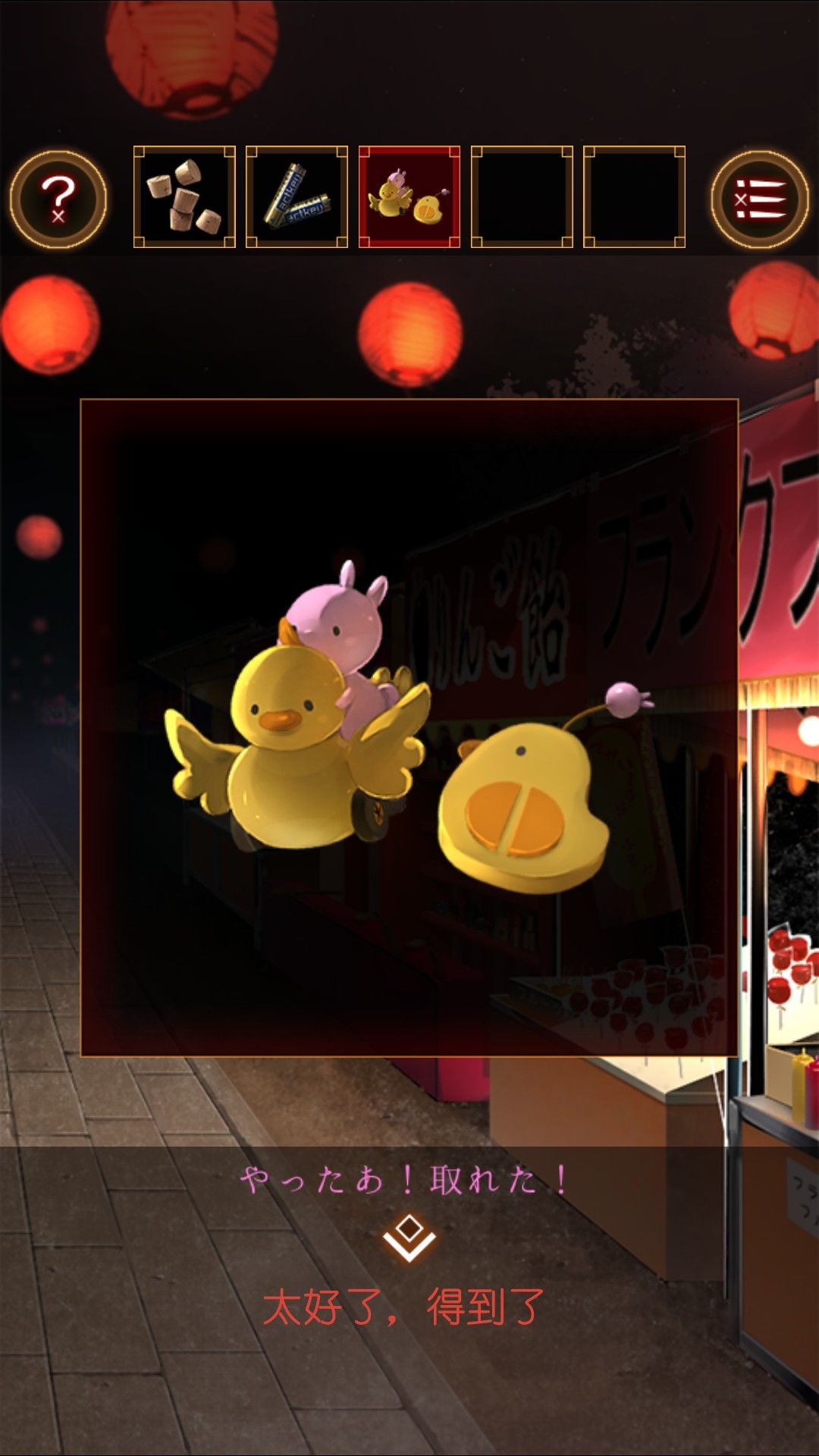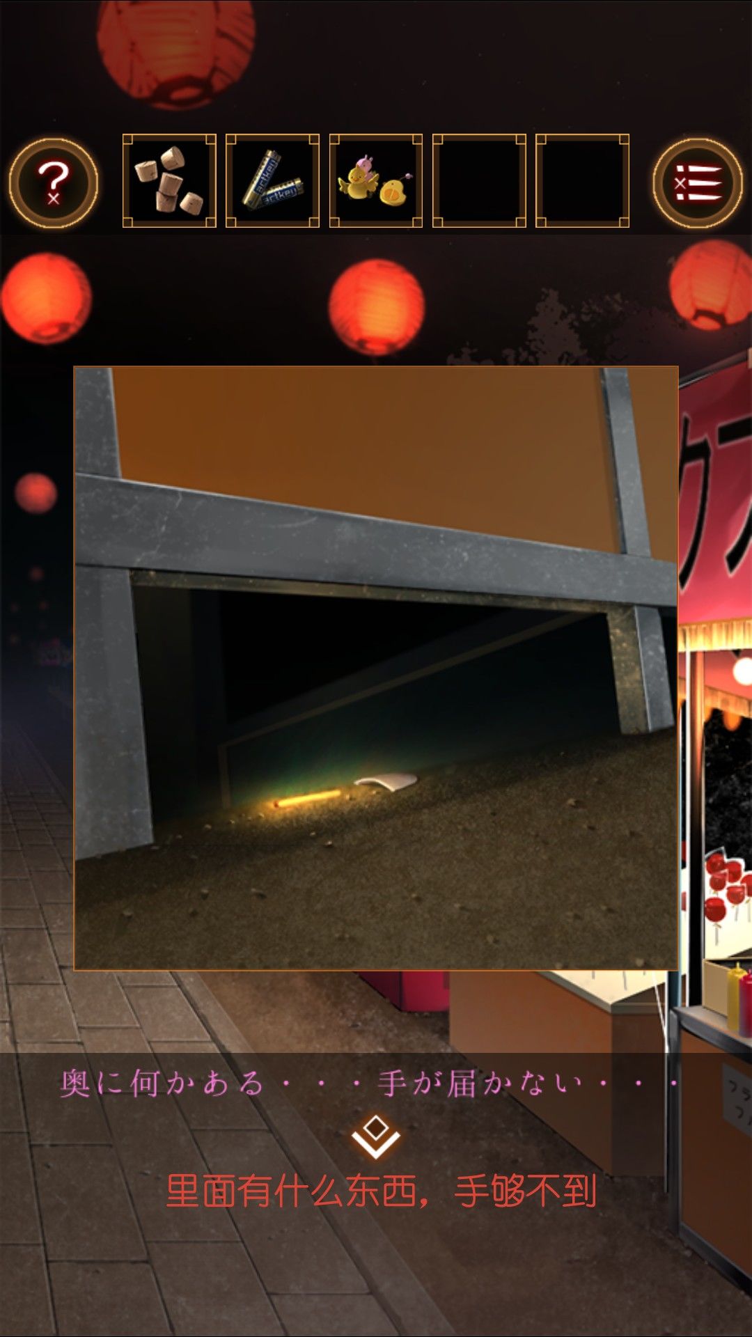 在小鸭子遥控里装入电池。在射击摊位旁的空店铺下面,放入荧光手环,操作电动小鸭子得到面的碎片。