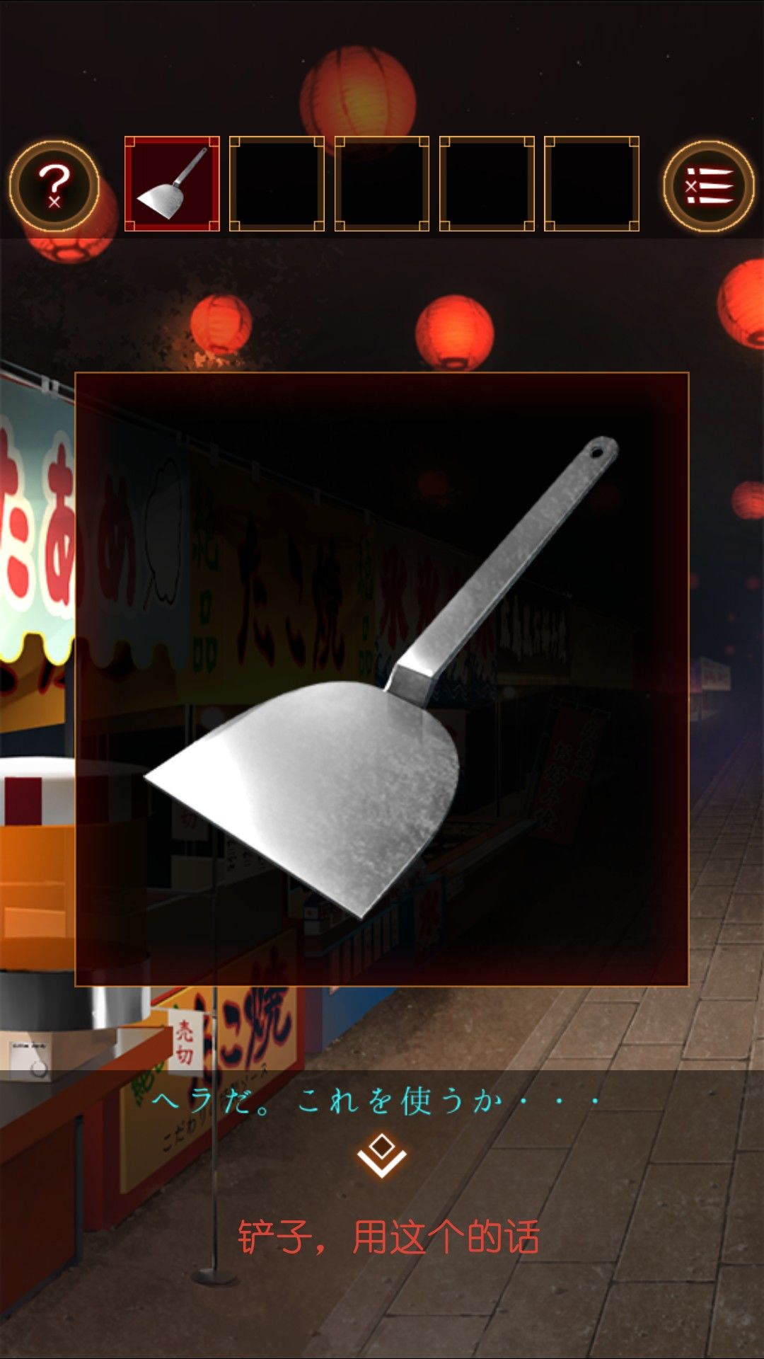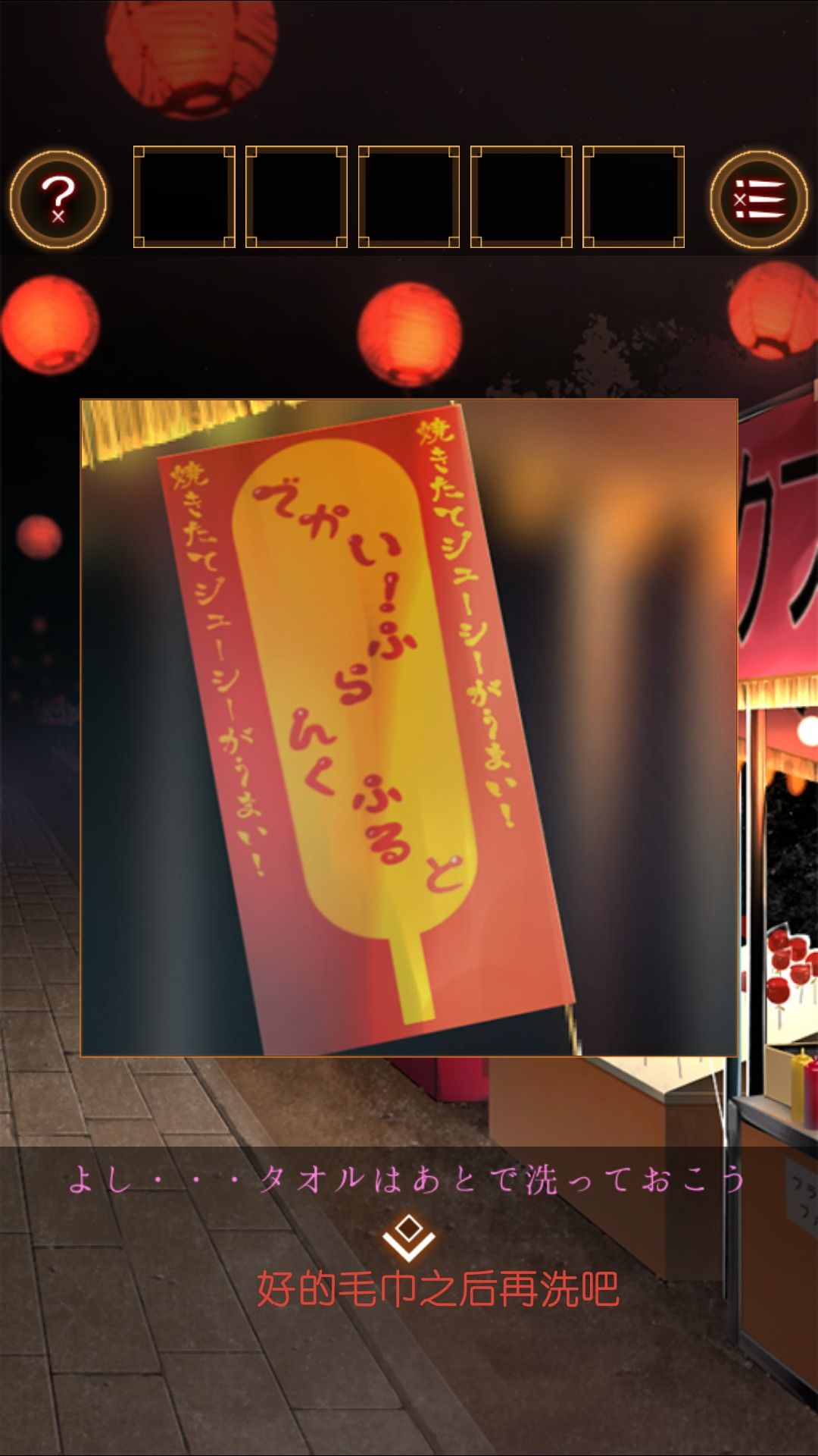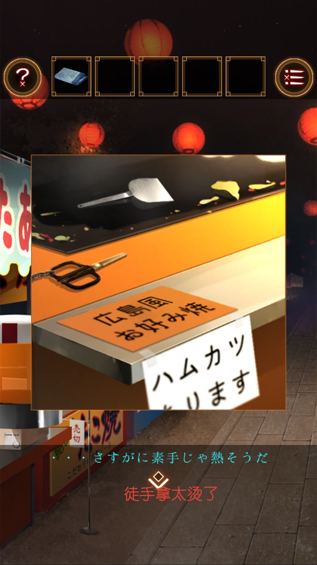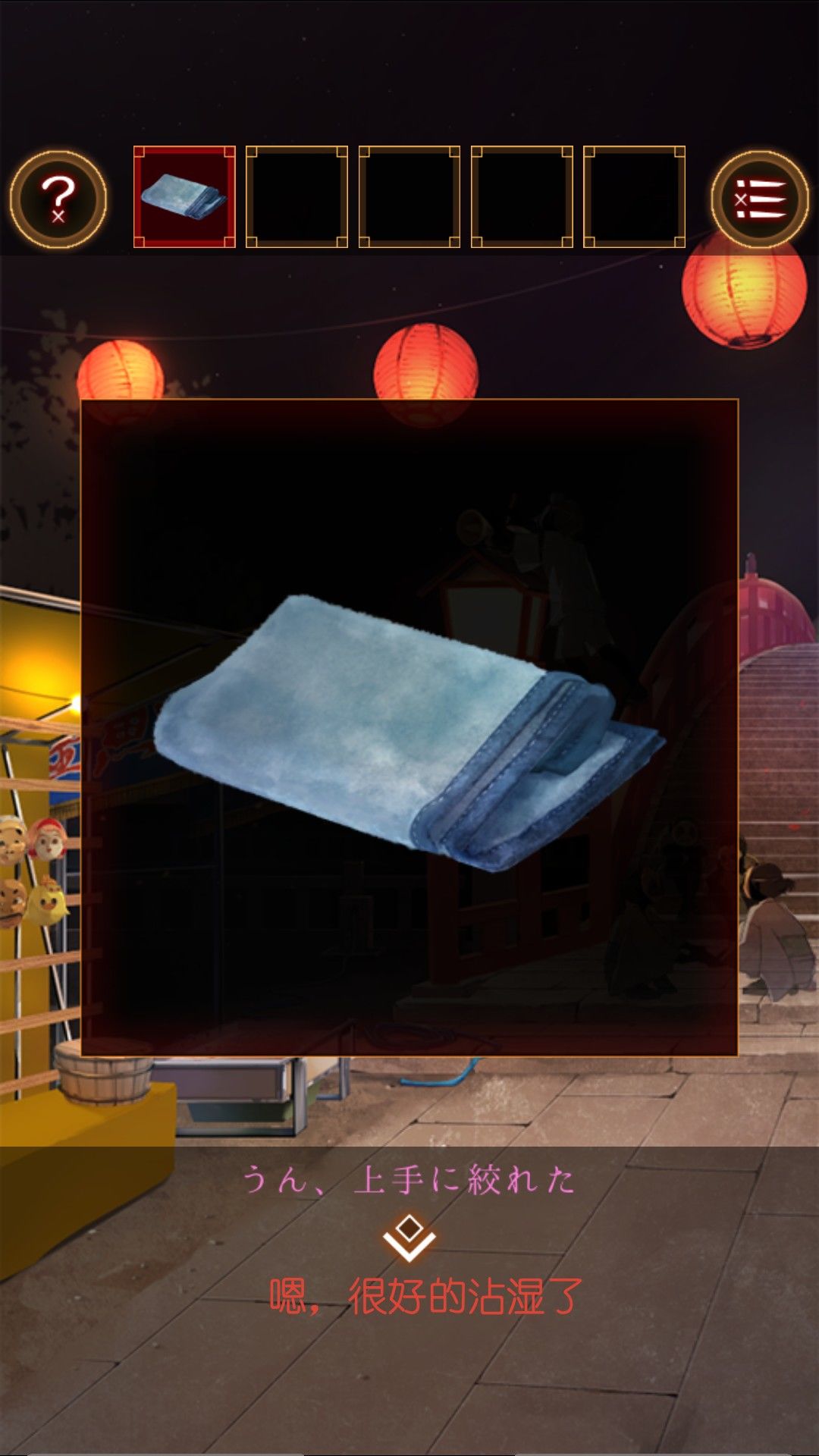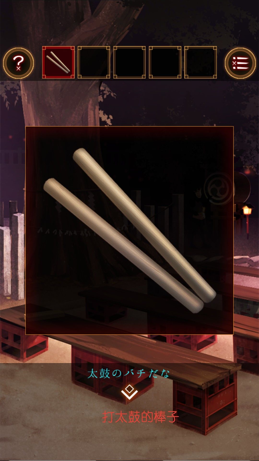 得到湿毛巾,用湿毛巾拿起位于文字烧摊上的铲。去太鼓那里,用铲子打开桌上的木盒。打开得到太鼓的棒。打开盒子的盖子,看到图案右左左右左右