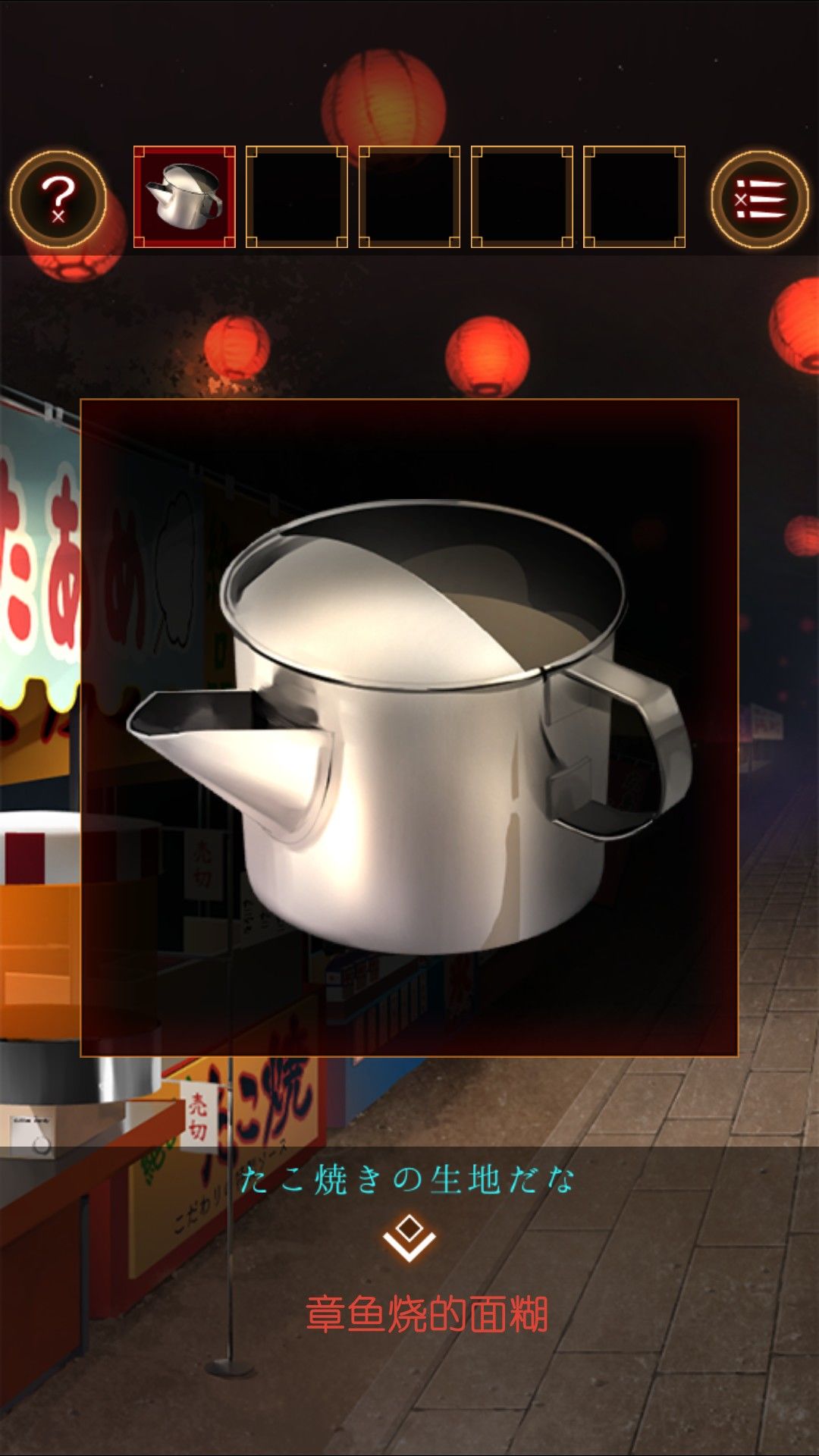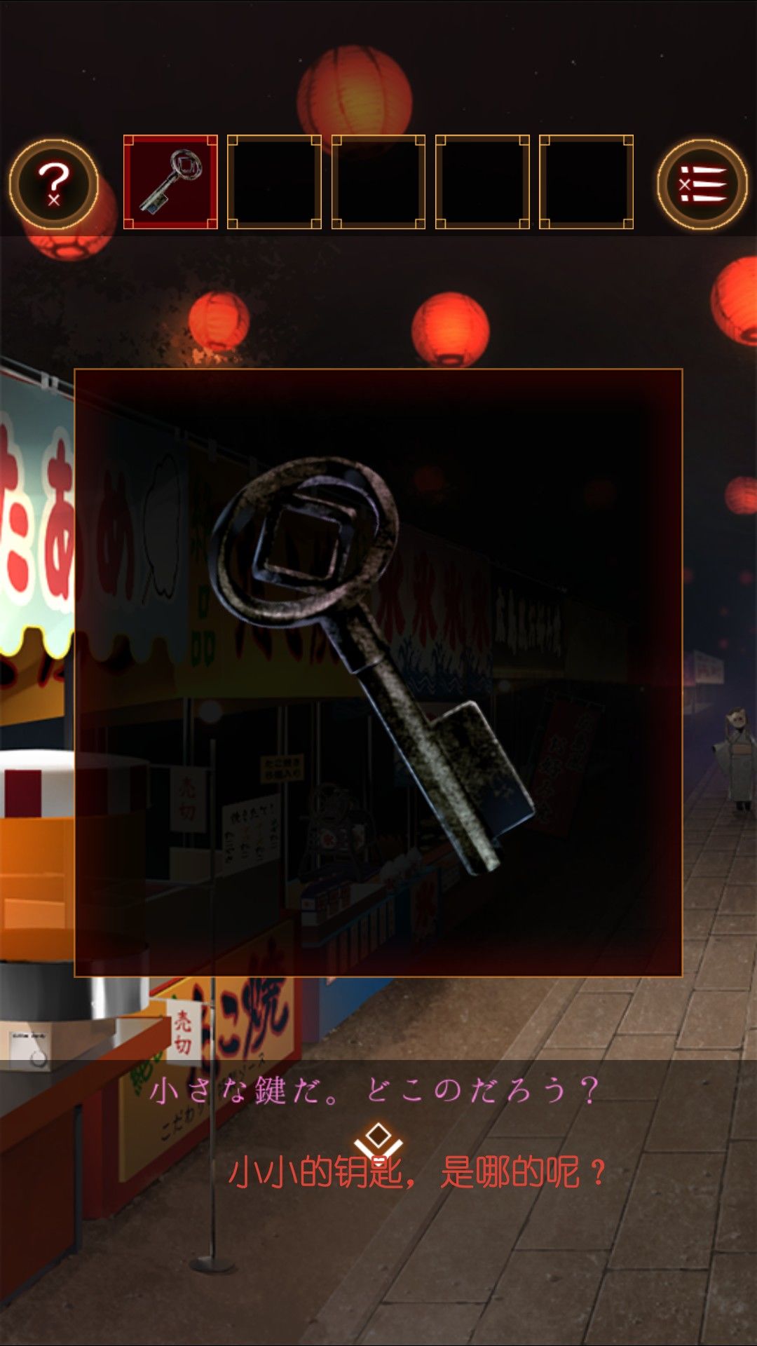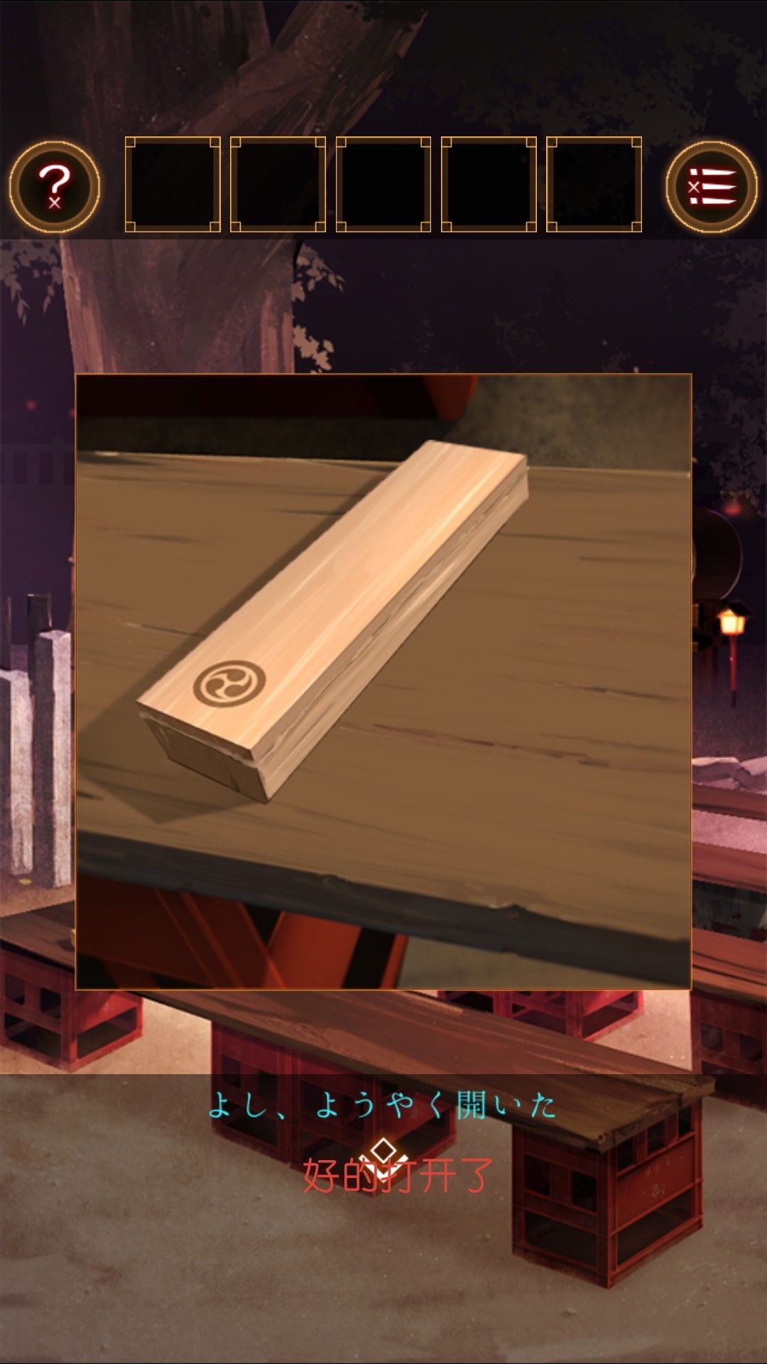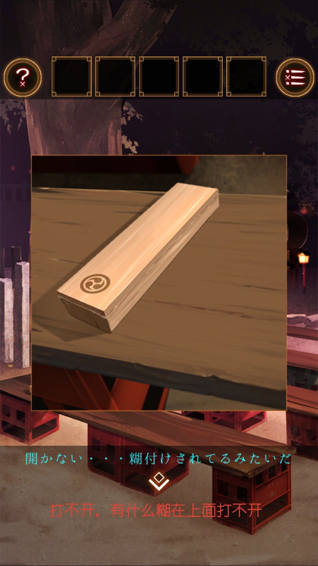 得到湿毛巾,用湿毛巾拿起位于文字烧摊上的铲。去太鼓那里,用铲子打开桌上的木盒。打开得到太鼓的棒。打开盒子的盖子,看到图案右左左右左右