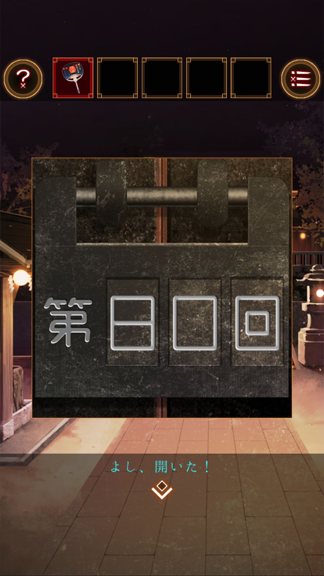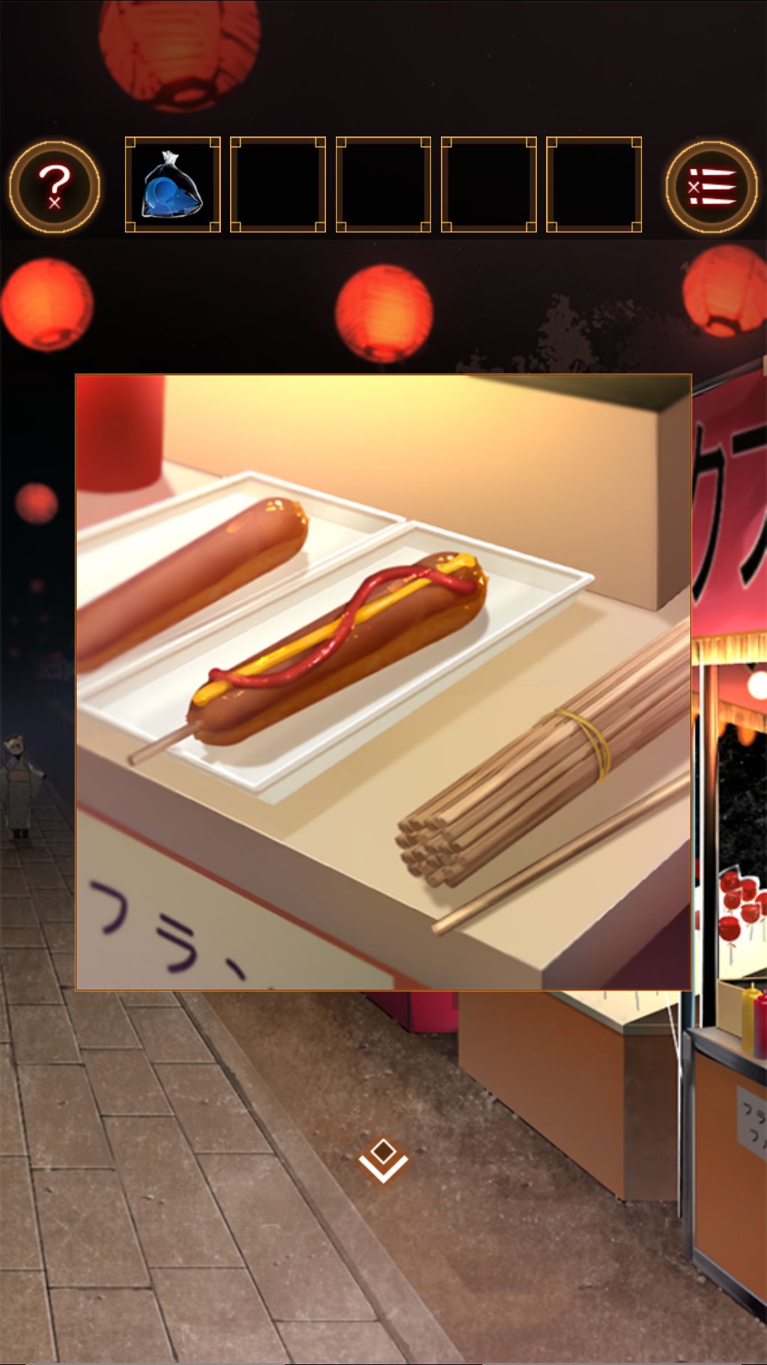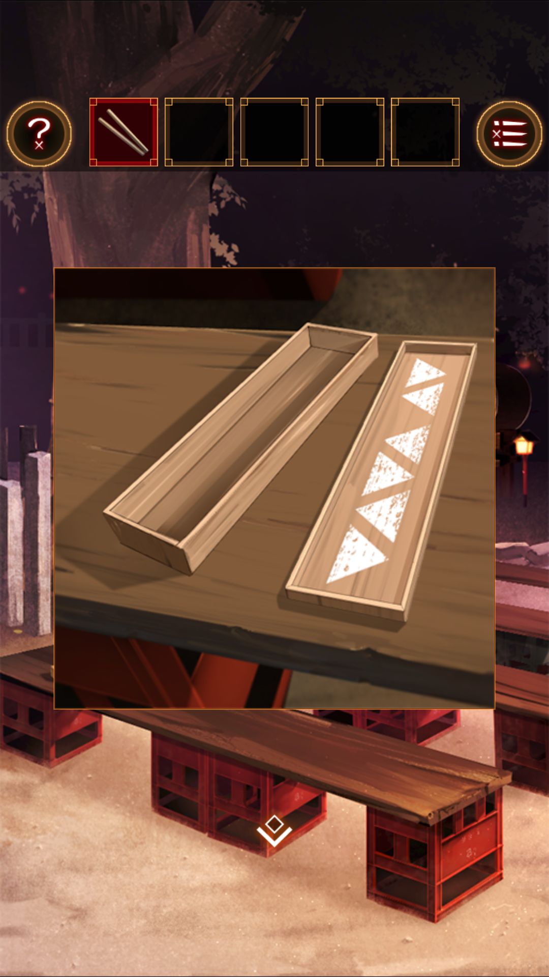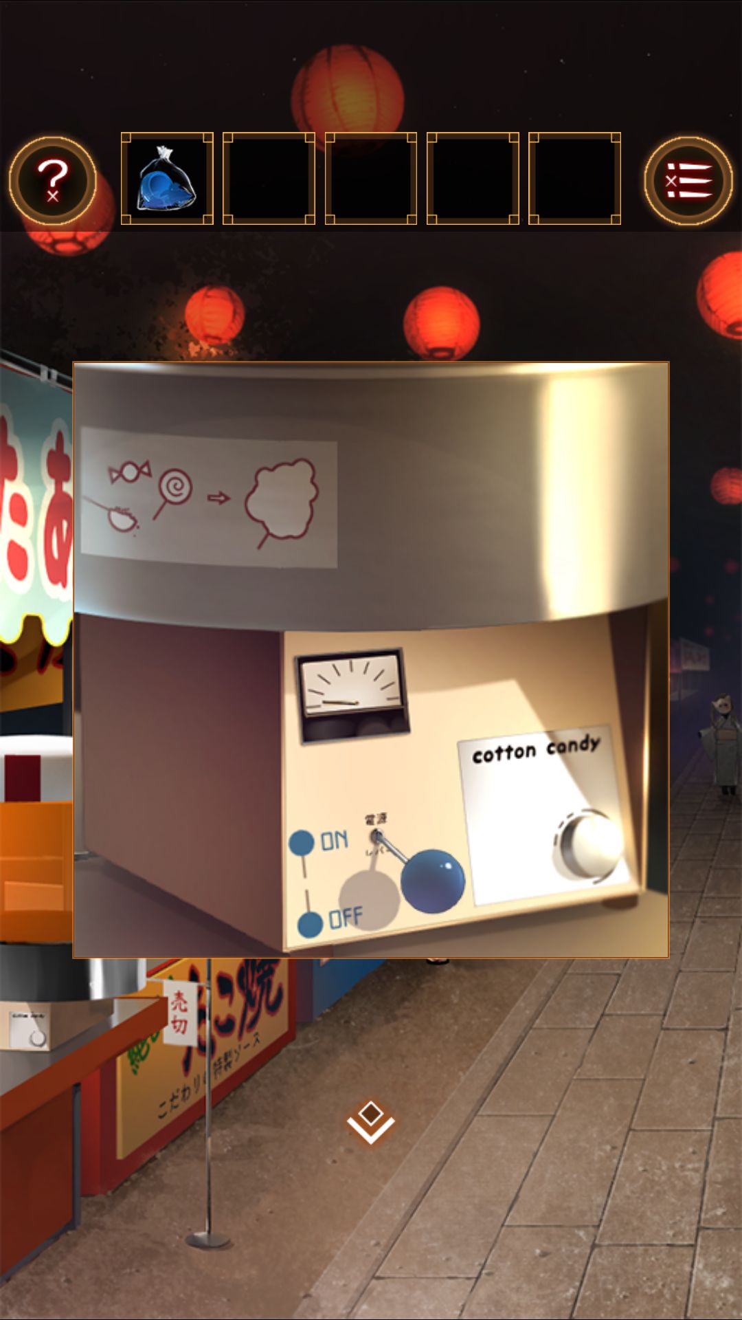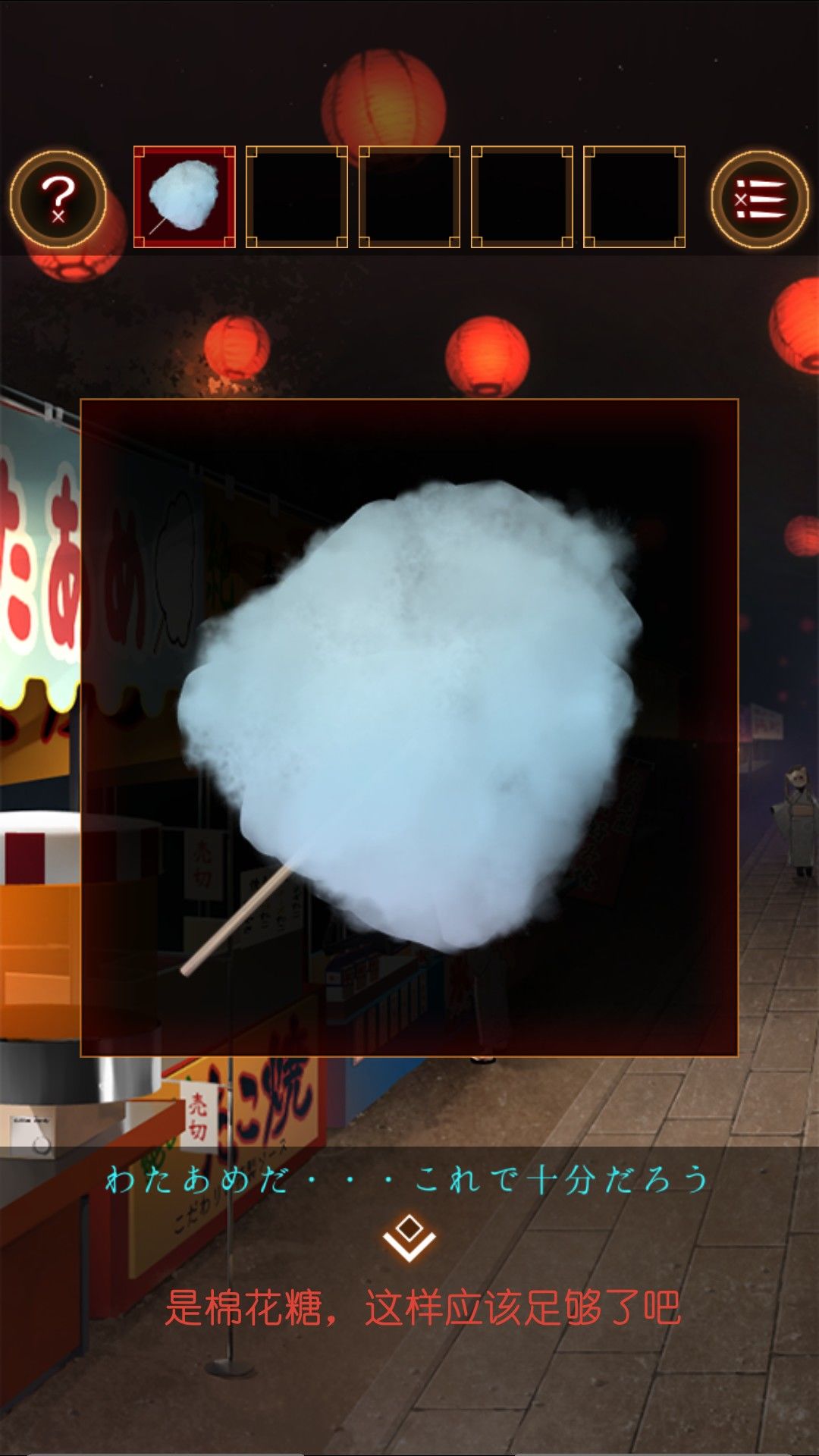 得到湿毛巾,用湿毛巾拿起位于文字烧摊上的铲。去太鼓那里,用铲子打开桌上的木盒。打开得到太鼓的棒。打开盒子的盖子,看到图案右左左右左右