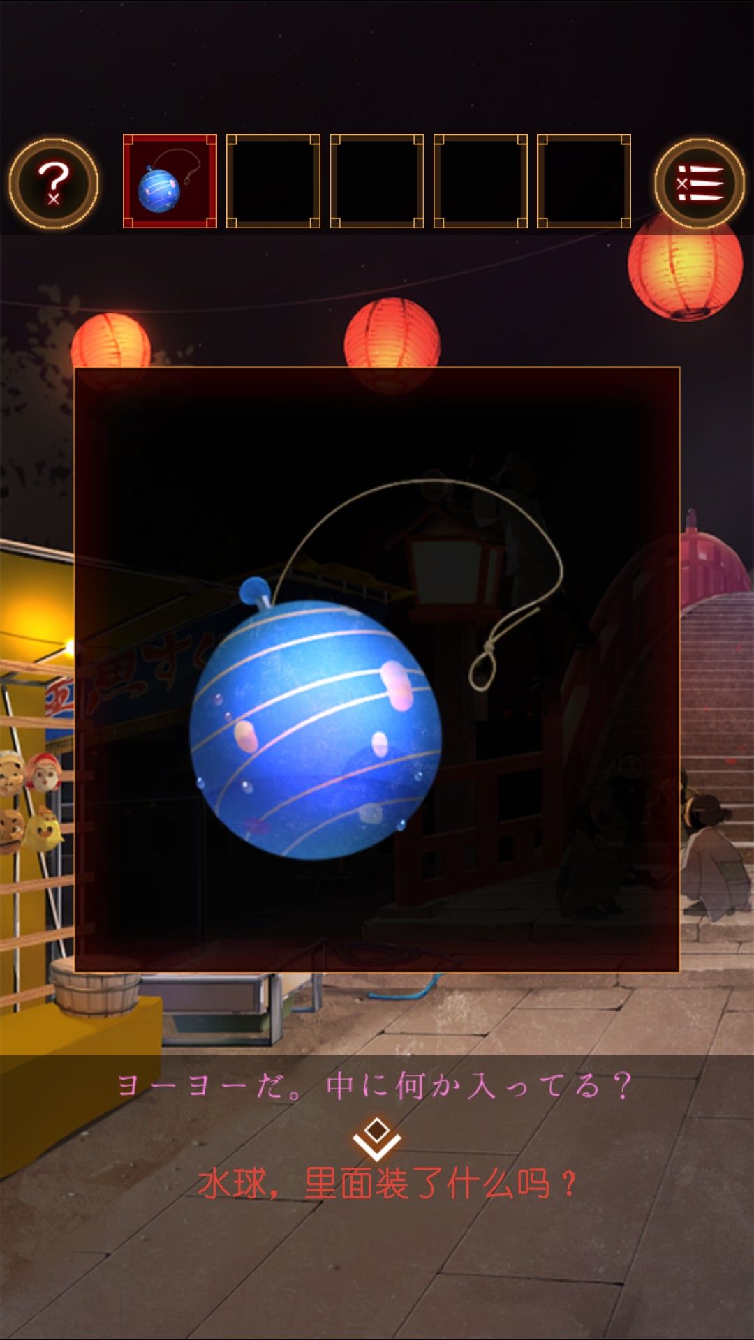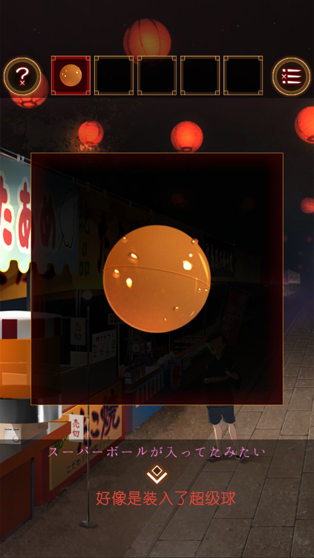 招聘上红色部分写着:刚考好多汁美味。黄色部分写着:超大!热狗。查看热狗摊上的热狗。红色的曲线样子和招聘上的红色文字一致。而中间有黄色线贯穿。对照招牌,得出密码:からふる。去金鱼池旁的面具摊。将密码输入箱子。打开箱子。得到水球。