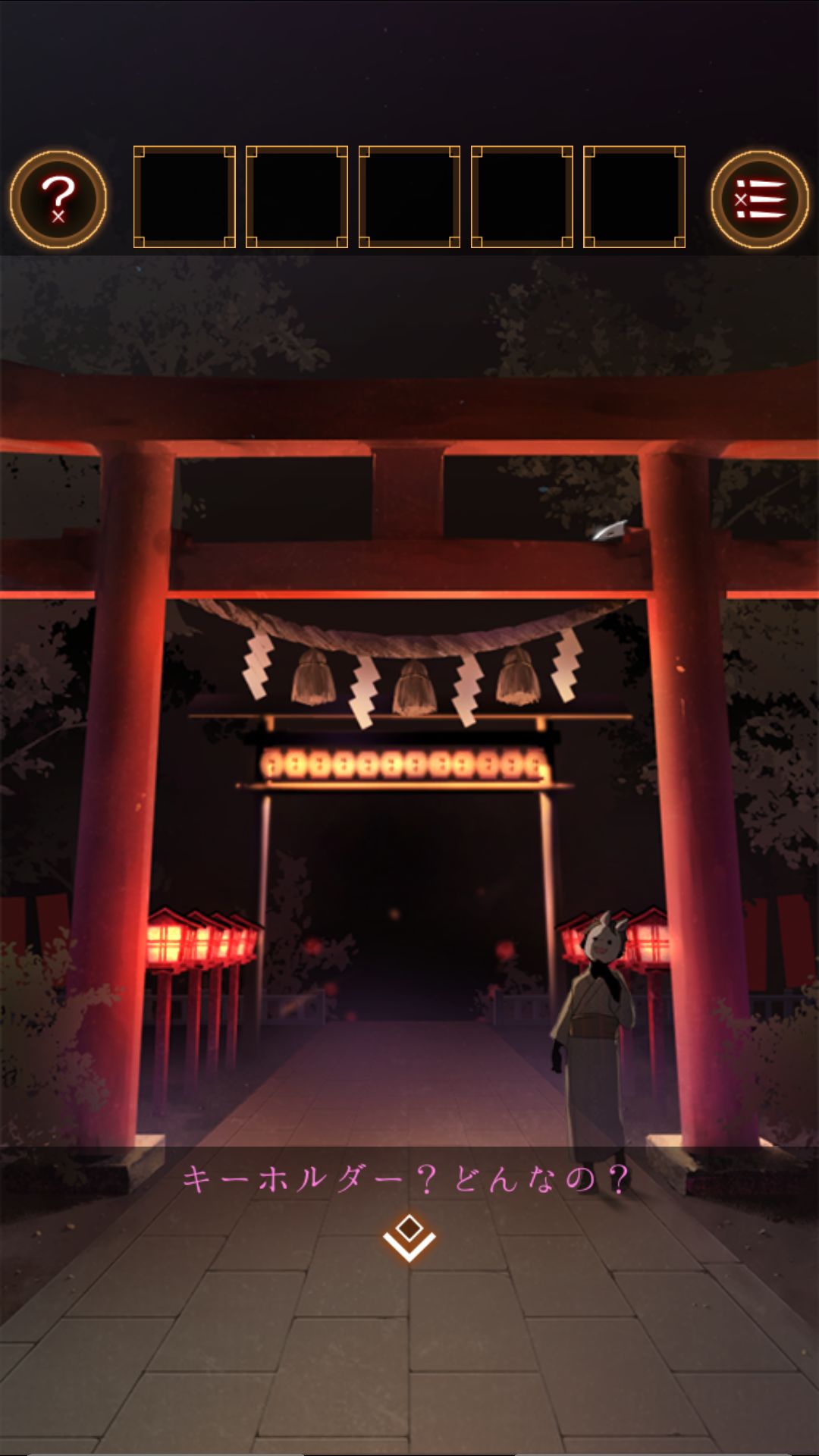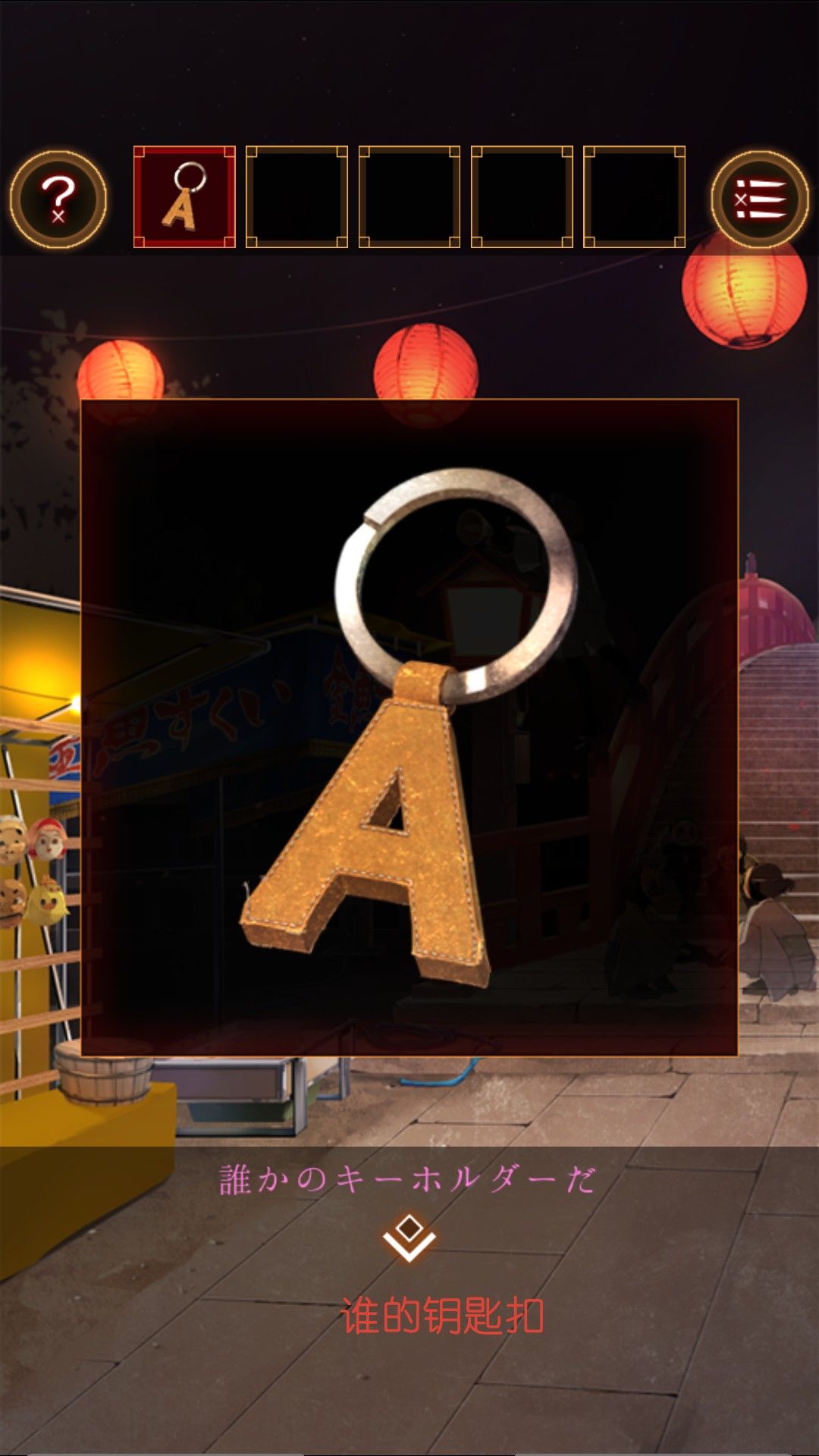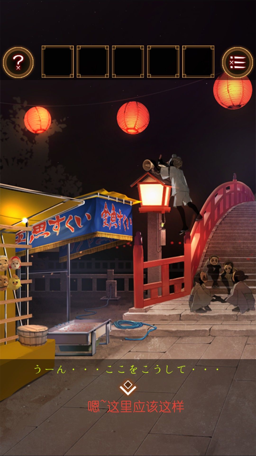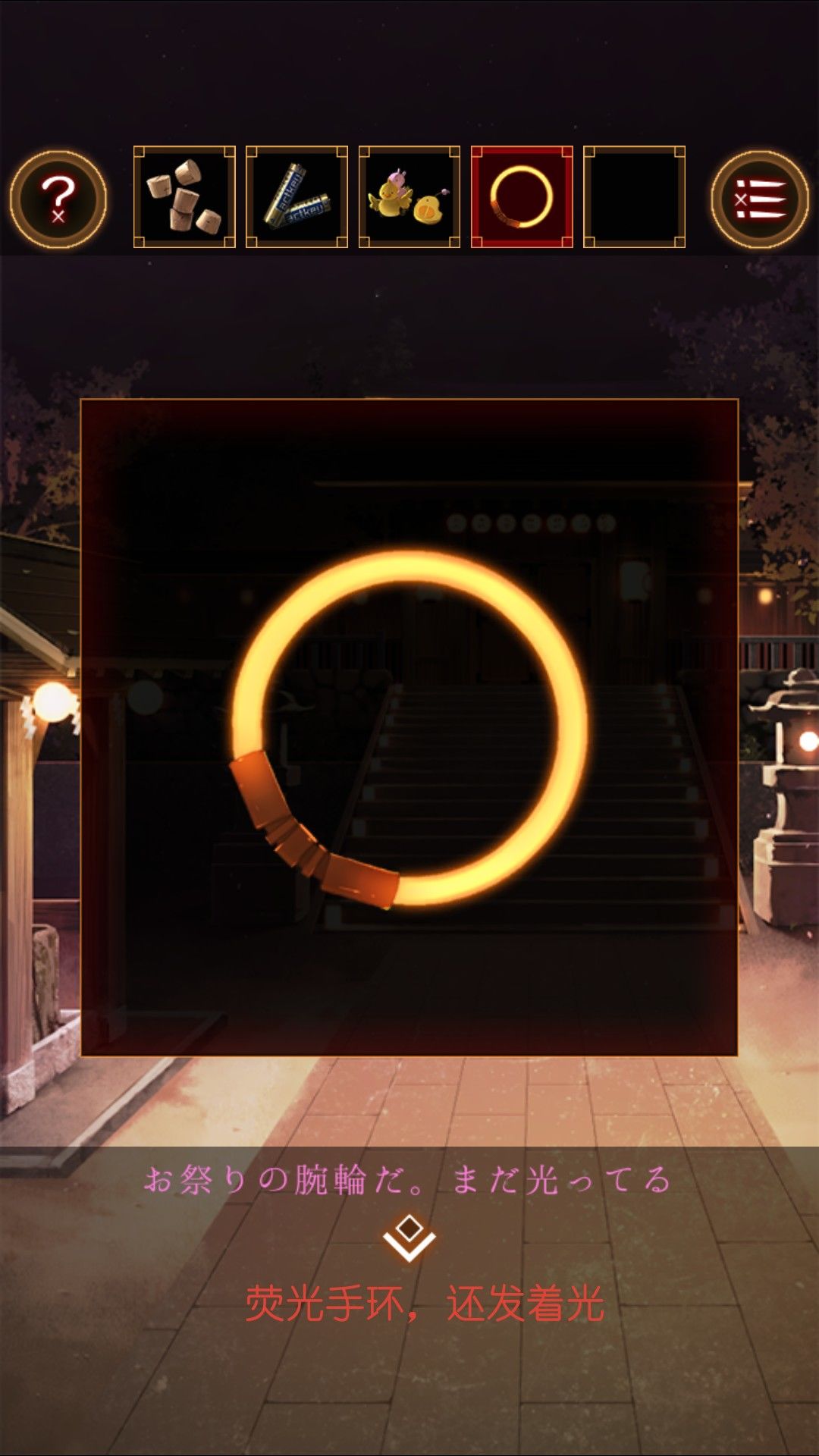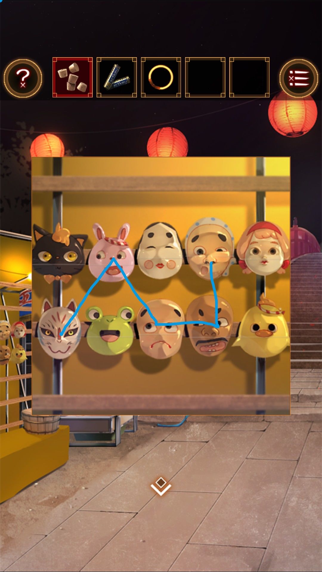 捡起泉边的荧光手环,观察面具,人面指向狐面。面具摊有同样的面具,观察面具发现上下有五个,共有十个,和射击摊位的物品摆放一致。看面具的视线得到顺序。
