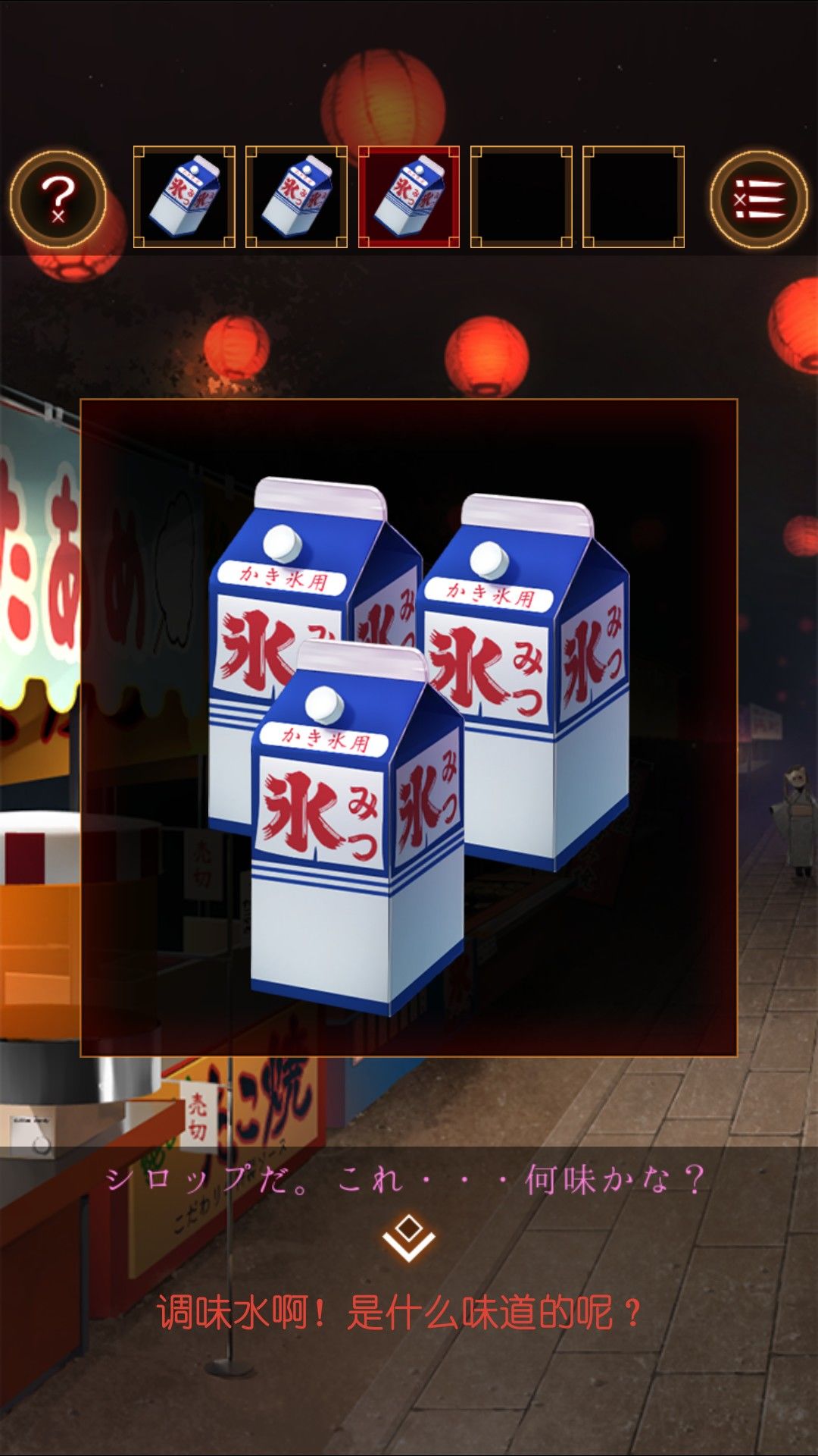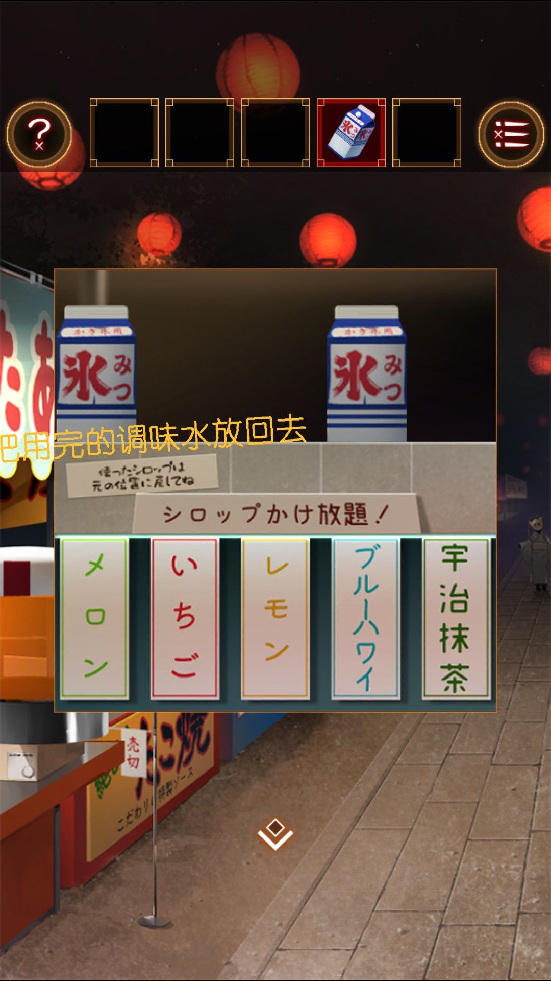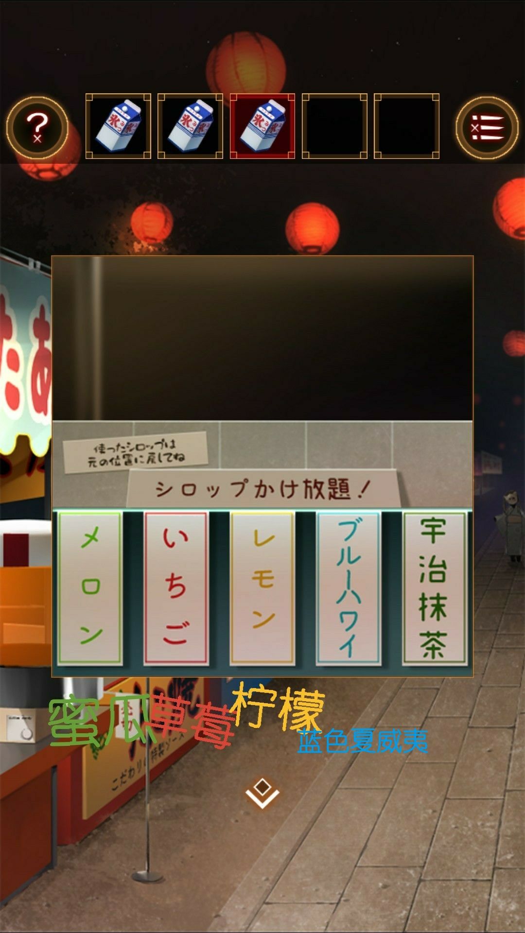 拿起刨冰调味水。装上转轮做出刨冰。在刨冰上测试后,发现味道分别是(从左到右)蜜瓜,蓝色夏威夷,草莓。将调味水的容器,放置于刨冰台左边的白色箱子中。正确摆放得钥匙。