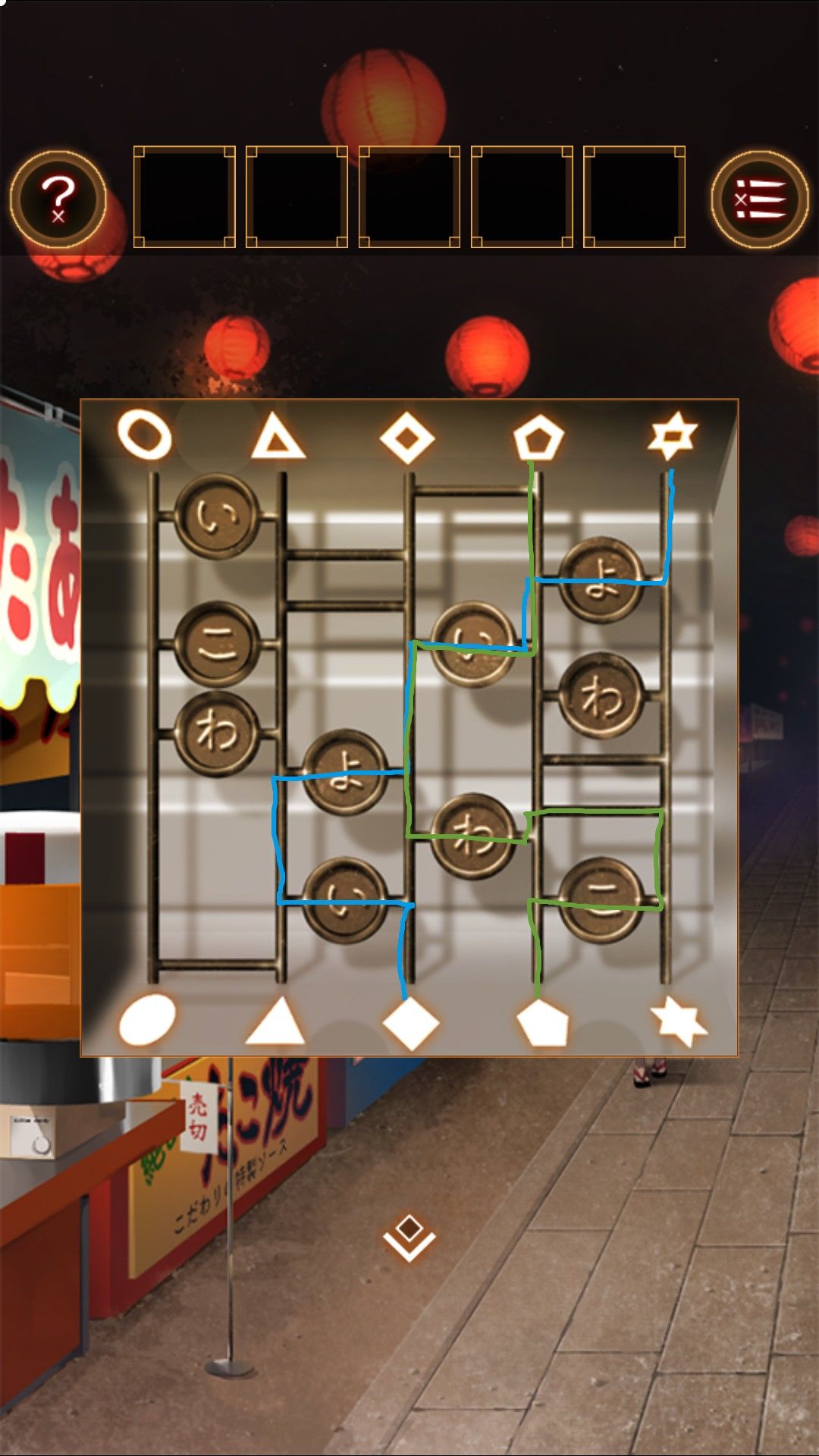 得到密码:六芒星(線),菱形,五角星,五角星(線)。
