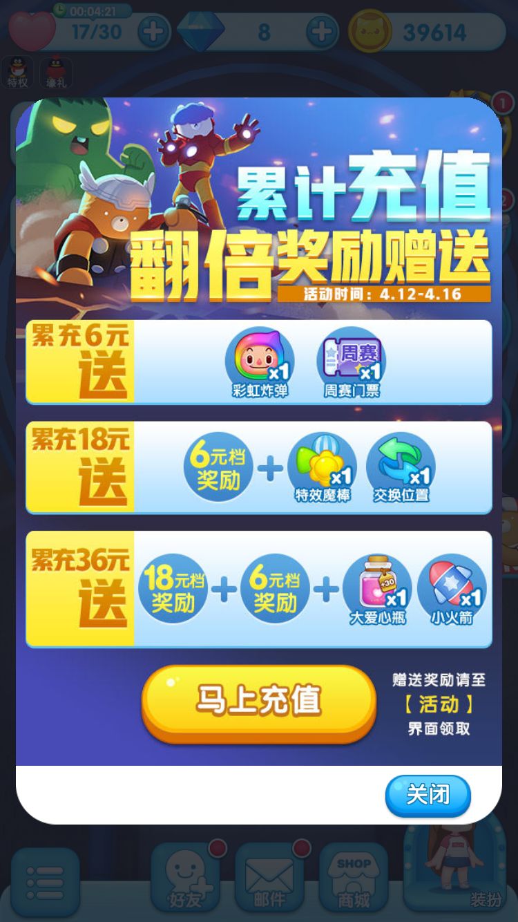 第三种获得门票的方式就是充值了。仅仅只需要充值6元,除了必得的60钻外,还会赠送彩虹炸弹和周赛门票各一。这是获得周赛门票最简单粗暴的方式了,但是可惜的是这种超值的门票获取方式一个帐号只有一次机会。与上面两种门票获得方式不同的是,这种方式获赠的门票需要到活动页面手动领取,而不是自动到帐。