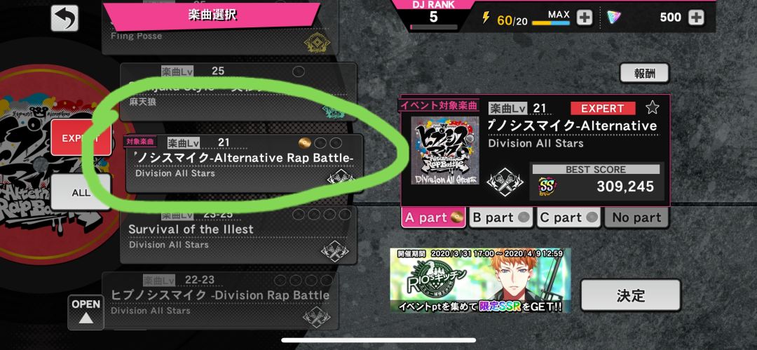 绿圈圈出来的就是活动曲,只有一首,打碟后获得的分数前三位就是你本次获得的pt,如你的分数是309245,那你本次获得的pt就是309。如果带有活动卡或者你选的的助战好友有活动卡,可以再获得35%的pt加成。