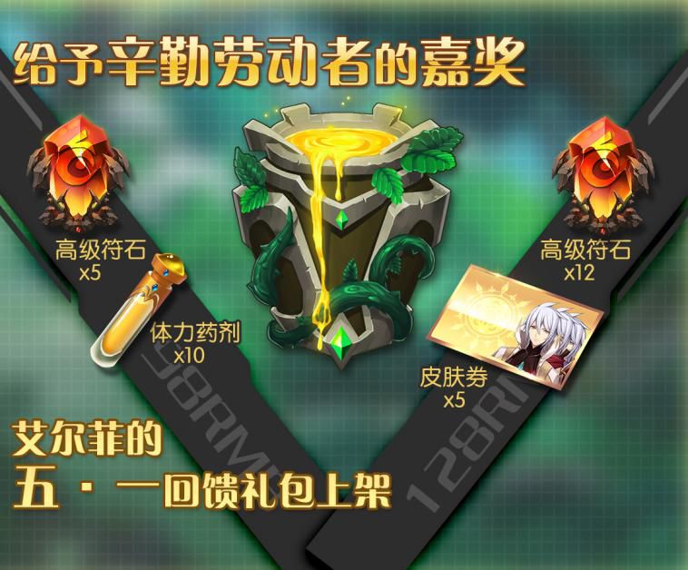 c)“劳动节召唤大礼包”内含“圣神水*1280,高级符石*12,皮肤券*5” 售价128 RMB