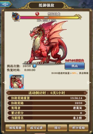 点进去之后,就是活动页面了,主要就是看加成角色,领奖励,看排名等。正常触发boss时都会有按钮直接到这个界面,不用玩家多费功夫。