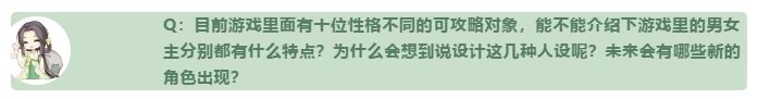 A:虐吗?我看到更多的是说我们的剧情太甜了。可能有的剧情会小虐一下,因为在北宋末年这个时代背景下,不可能只有岁月静好,一定会有历史本身所带来的沉重和思考。但我相信,刀尖舔糖,会更加刻骨铭心。我们一直也是以【做最甜的古风恋爱游戏】为目标在努力。