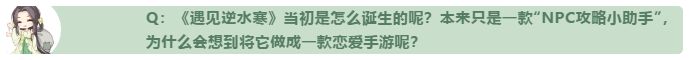 A:端游《逆水寒》的编剧们在创作端游剧情时,萌生了“想和笔下的角色谈恋爱”的想法,在得到团队支持后,我们敏捷地开发了这个小助手。因为“NPC攻略小助手”获得了许多玩家的喜爱,我们觉得有义务和责任让这些角色更长久地陪伴每一个喜爱他们的玩家,把这份美好的恋爱延续下去。所以我们希望可以打磨好遇见的品质,让这个小助手升级成手游,在这趟宋朝浪漫之旅中陪大家长久地走下去。