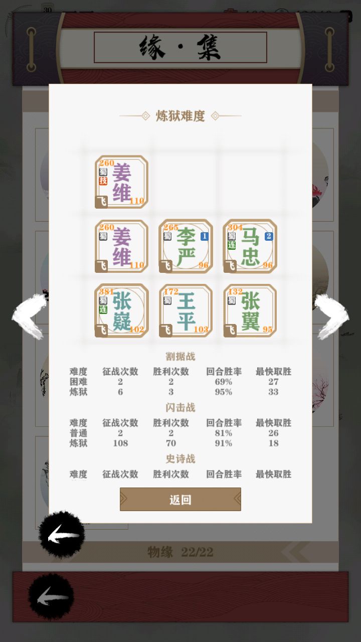 ③又分为空城12回合,三人出战15回合,一个指定武将单独出战几回合,不吃鸡肋,不复活(攻打新城池输了有一次复活机会),胜率100%(满血),割据36闪击24史诗48。
