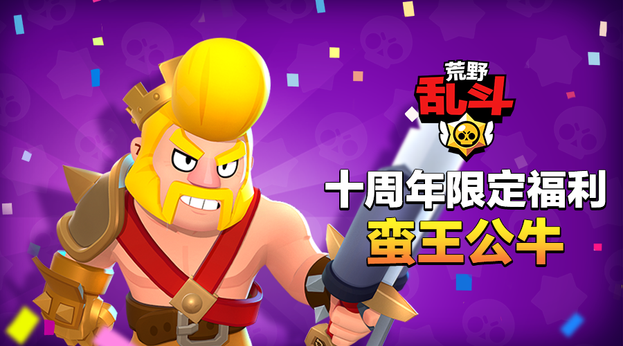 今天是Supercell十周年欢庆的日子,我们的所有游戏都为大家准备了礼物,《荒野乱斗》自然也不例外。所有的玩家在国服正式上线后(6月9日-6月30日),下载并登录游戏,即可进入游戏内商店免费领取Supercell十周年限定蛮王公牛皮肤!